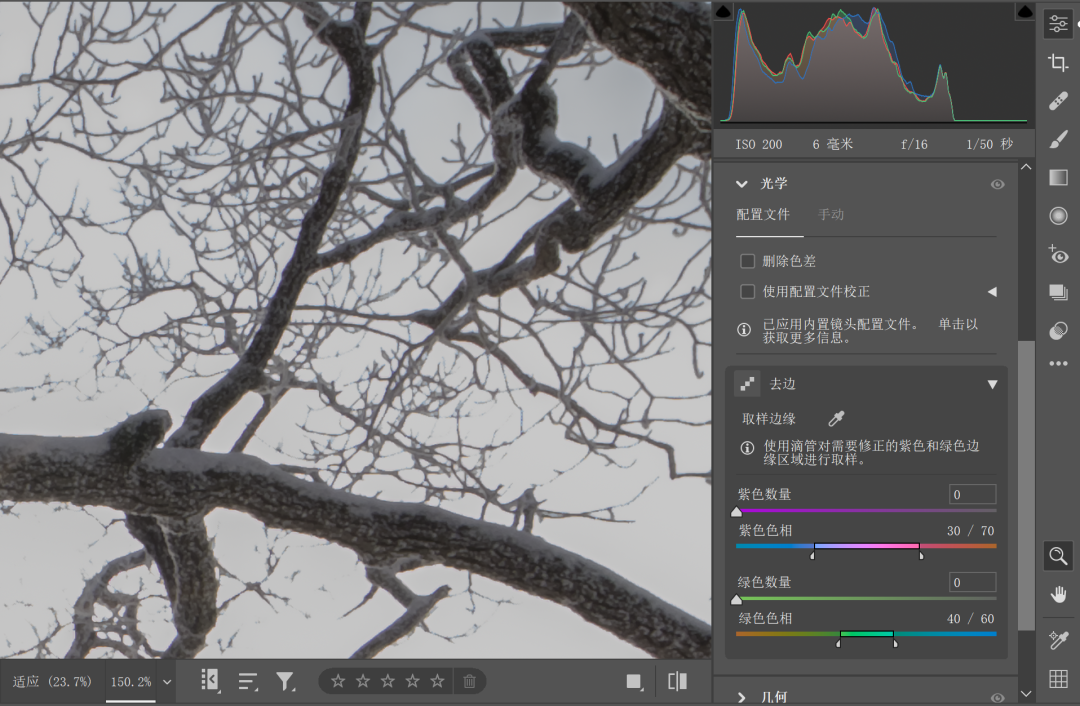暗角测试在家中进行并不是十分严谨,仅供参考,光源方向在右上方时F2/2.8暗角较为明显,收缩至F4时情况有较大改善,收缩至F5.6时暗角几乎消失。实拍过程中采用F5光圈拍摄时发现除暗角外边缘出现轻微绿色色偏,但没有太大影响。