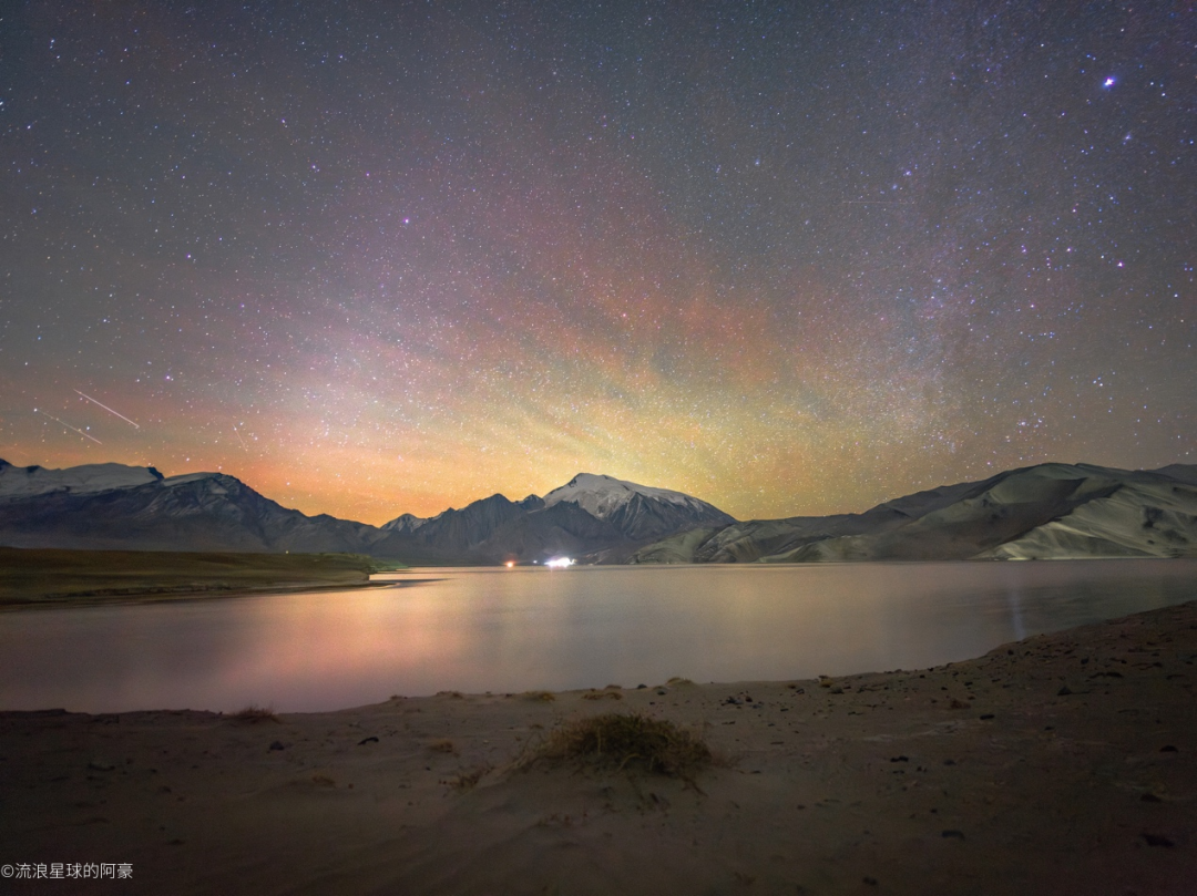 在帕米尔高原白沙湖畔,拍摄夜间公格尔峰背后五彩的气辉波纹与黄道光。