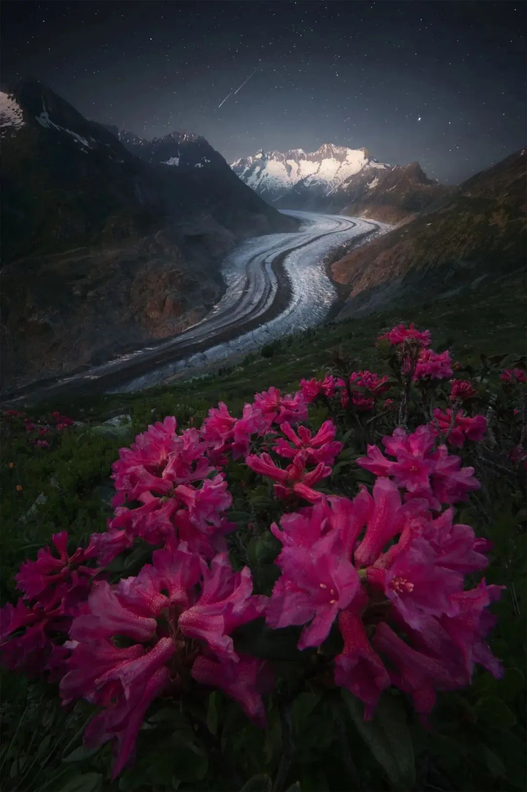 格鲁吉亚高加索山脉六月七月是格鲁吉亚高加索山脉的花季,在深入雪山脚下的草甸区域开满了各种杜鹃及黄色花丛。如果仅仅是花丛和雪山的融合并置在画面中,我个人还是觉得会有点单调,所以途中的溪流和彩虹为画面加分了不少。