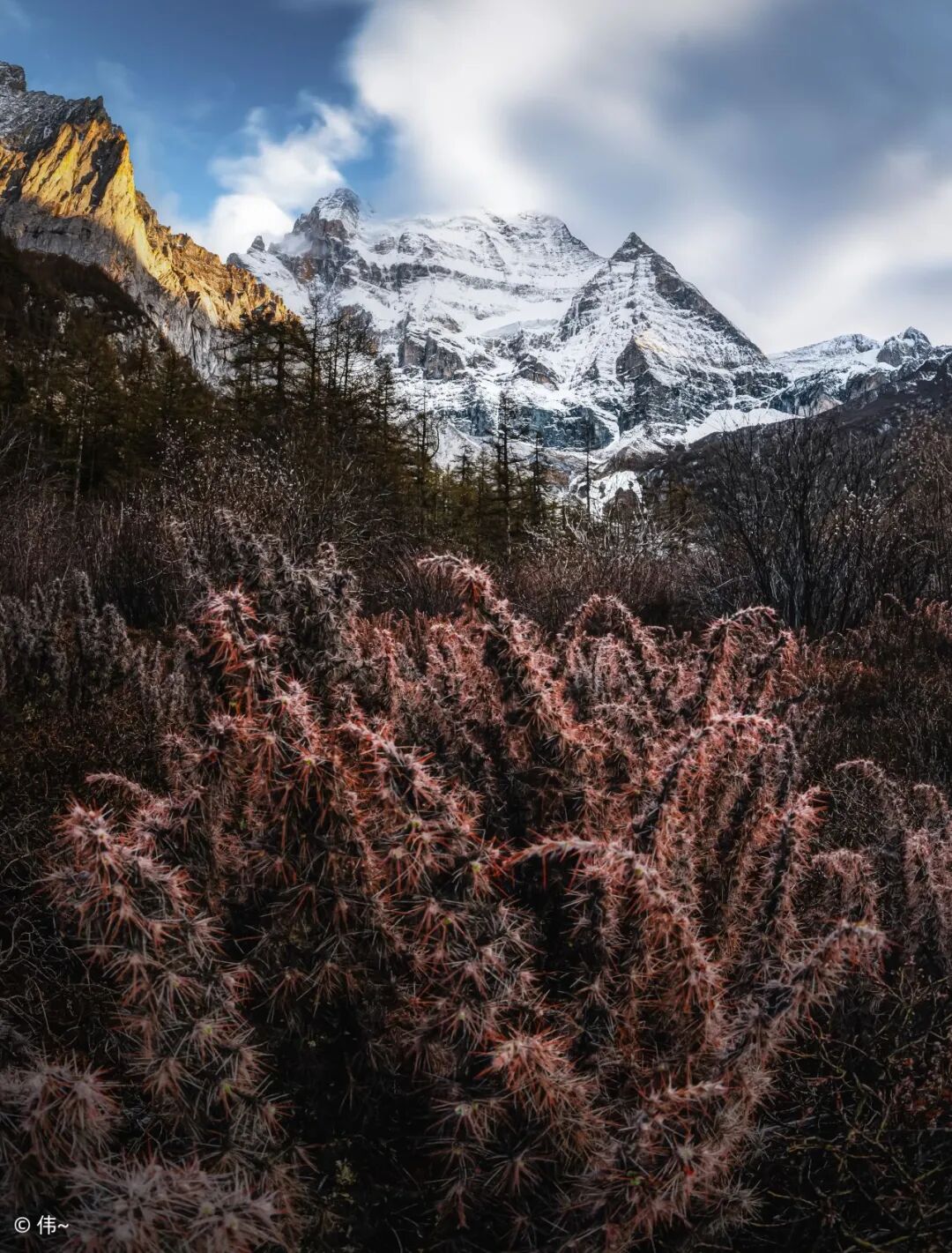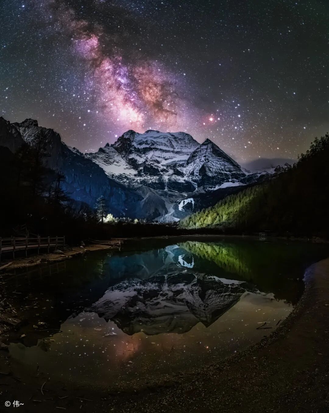 在稻城亚丁的珍珠湖,这里近距离直面高耸的仙乃日神山,180度的鱼眼视角让我可以同时记录下巍峨的雪山和银河,让画面更具有视觉冲击力。
