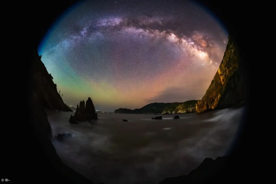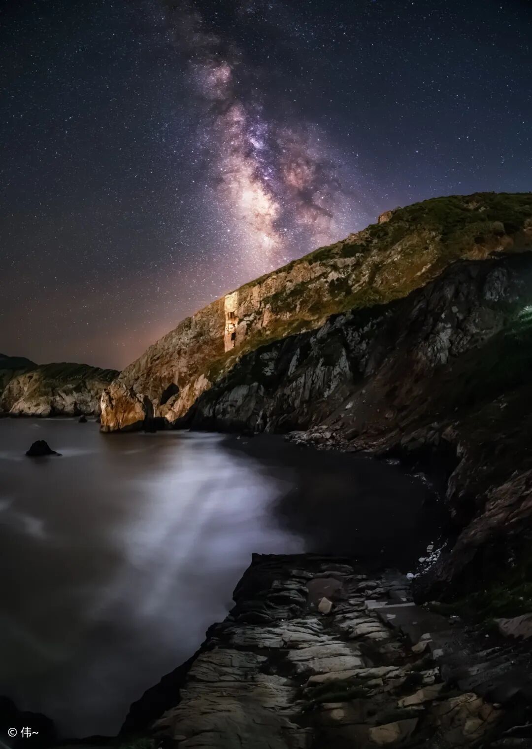 夜晚的霞浦浮鹰岛黑沙滩上,抬头看银河,低头看海浪,我分别用8mm端和15mm端捕捉到了黑沙滩与银河同框。