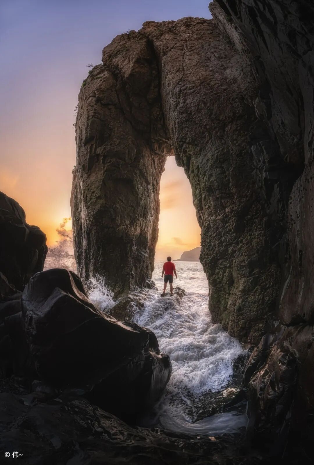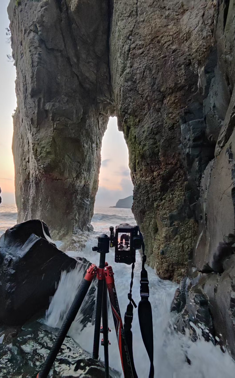 在黑沙滩上,有一座礁石形成的天然拱门,由于日出时分需要抵近距离拍摄,而近距离看拱门十分高大,一般镜头难以拍全,而使用鱼眼镜头15mm端高达175度视角让我得以一张照片就可以囊括整个拱门和地上的礁石,为此我在礁石上架好相机保持视角不变,用了高速快门抓拍海浪,利用分区包围曝光和时间合成完成了这幅作品。