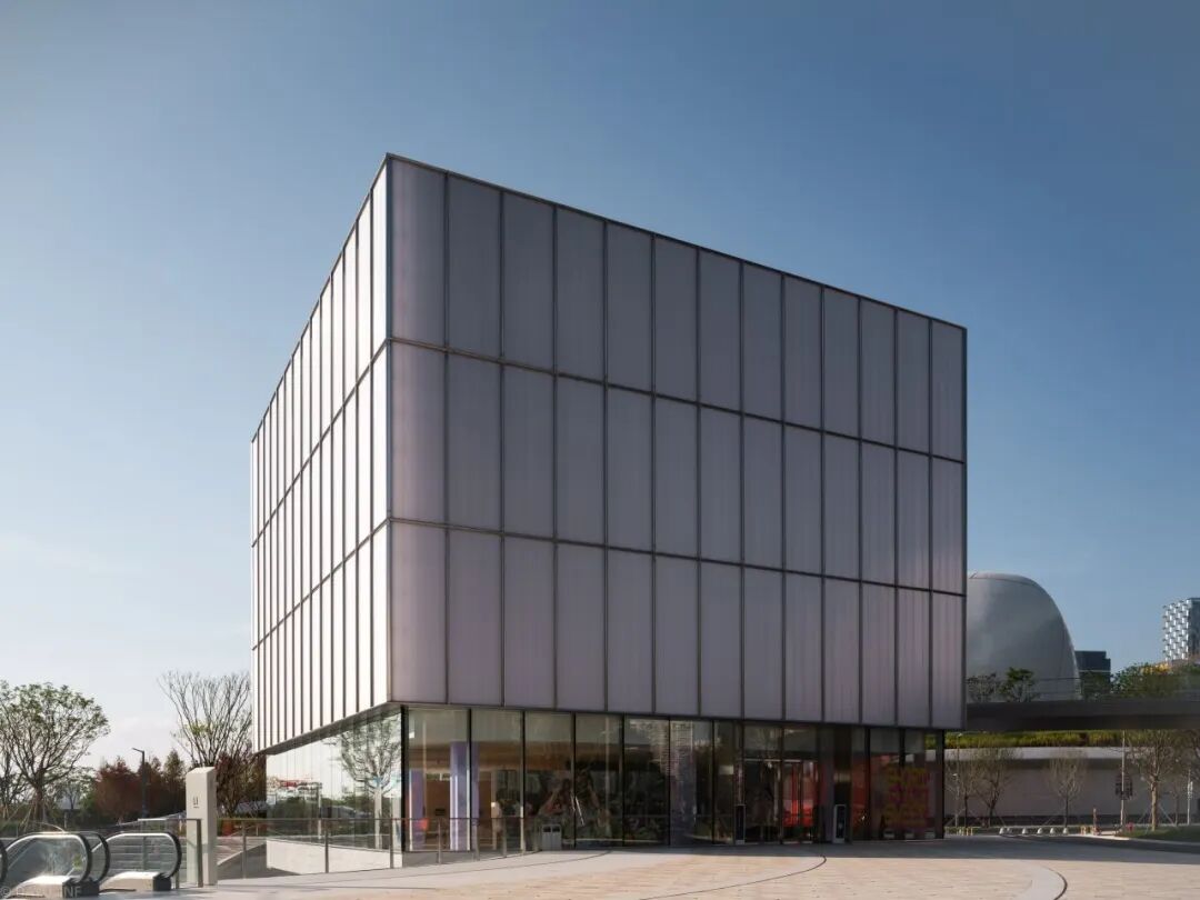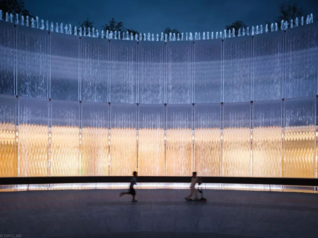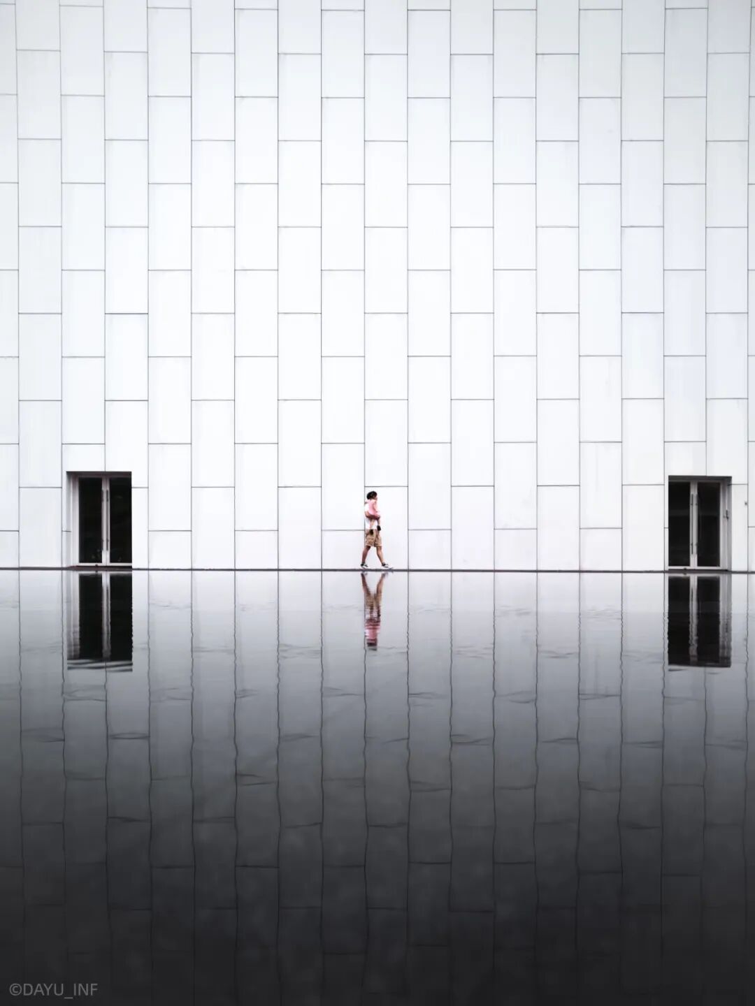 转战深圳光明艺术中心时,建筑外面布满了规则的白色板材,在水面的倒映下,更加充满韵律感,当一位年轻的父亲抱着他女儿走过,又为冰冷的建筑添加了温暖。