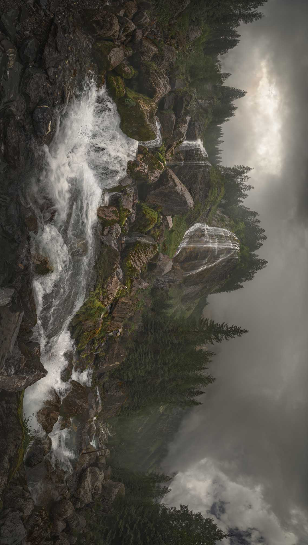 所以我决定使用横向大幅接片展现其溪流瀑布的全景地貌,如果你问我全景接片拍摄有什么优势?那我会不假思索的回答,展现其自然景观的恢弘气势,并在后期接片中利用线条与形状的形变从而突出画面的张力美学。