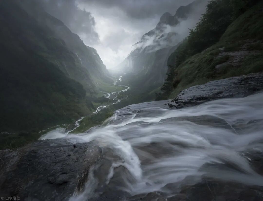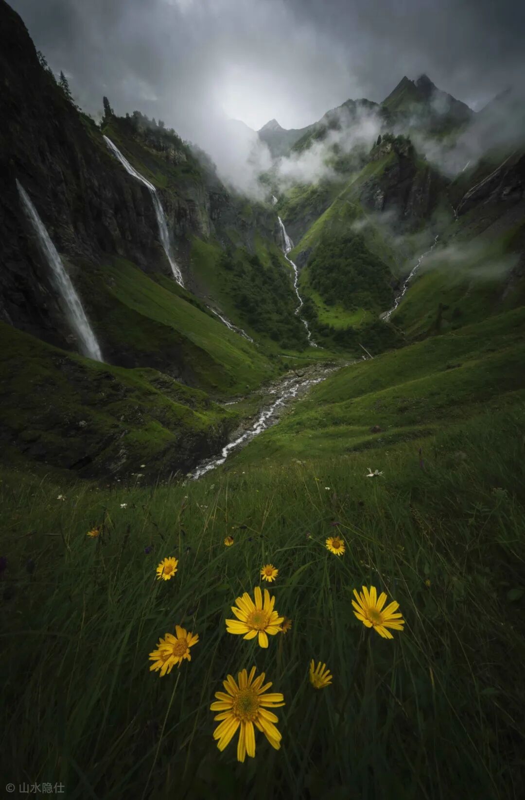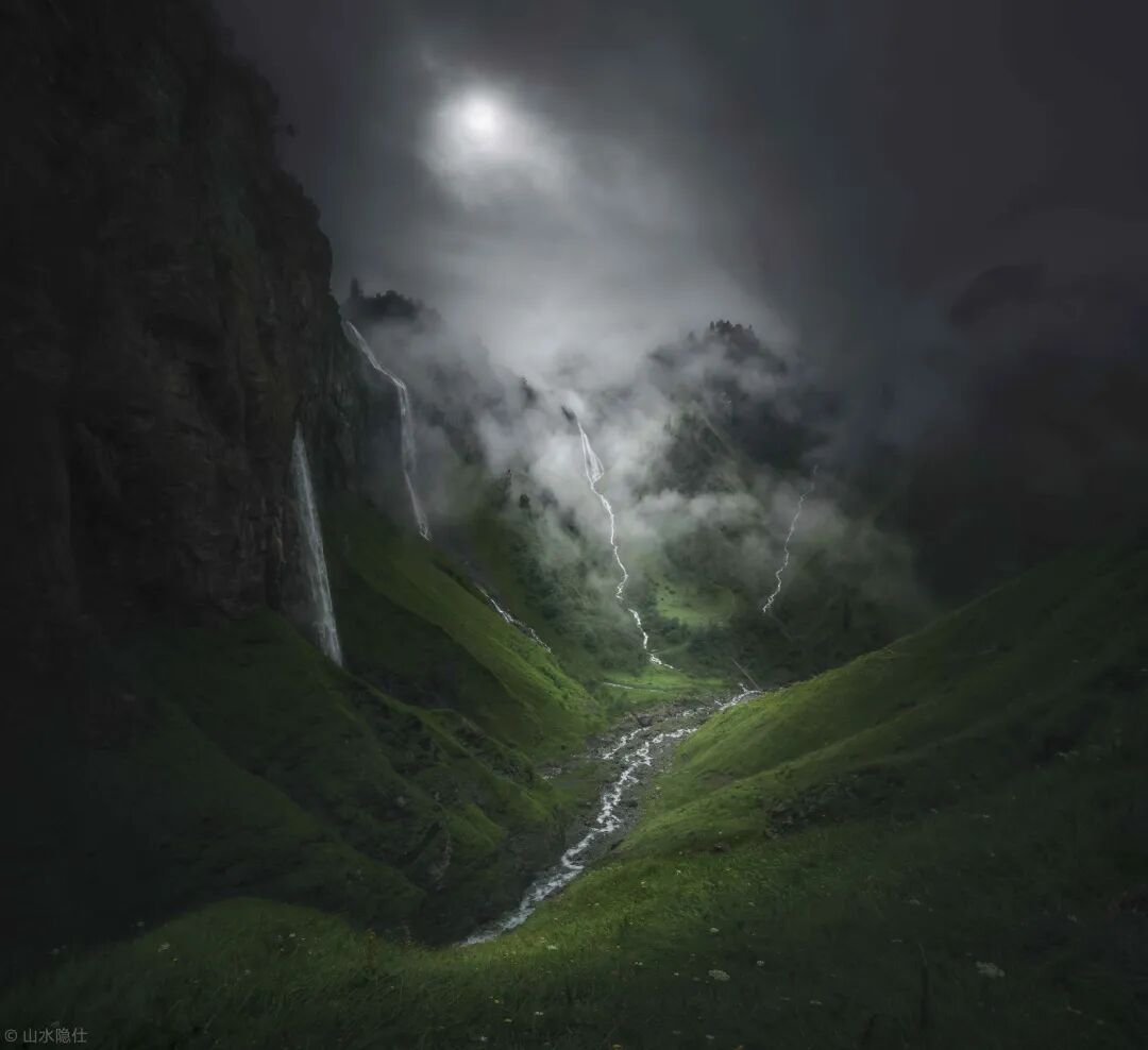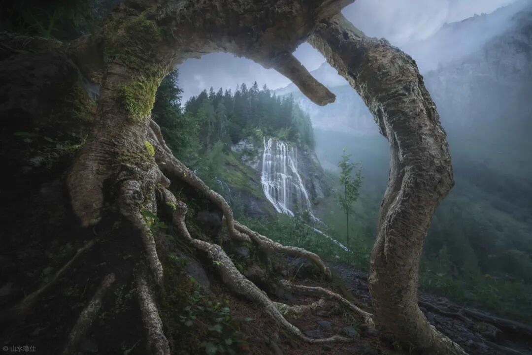 镜头转向瑞士——这是我第二次来了。都说欣赏瑞士最好的方式是徒步,我依旧选了一个下雨天,充沛的雨量能保证远处的瀑布群足够的壮观,同时雨天造就的云雾就像给画面施加了一层魔法,显得神秘而又美丽。