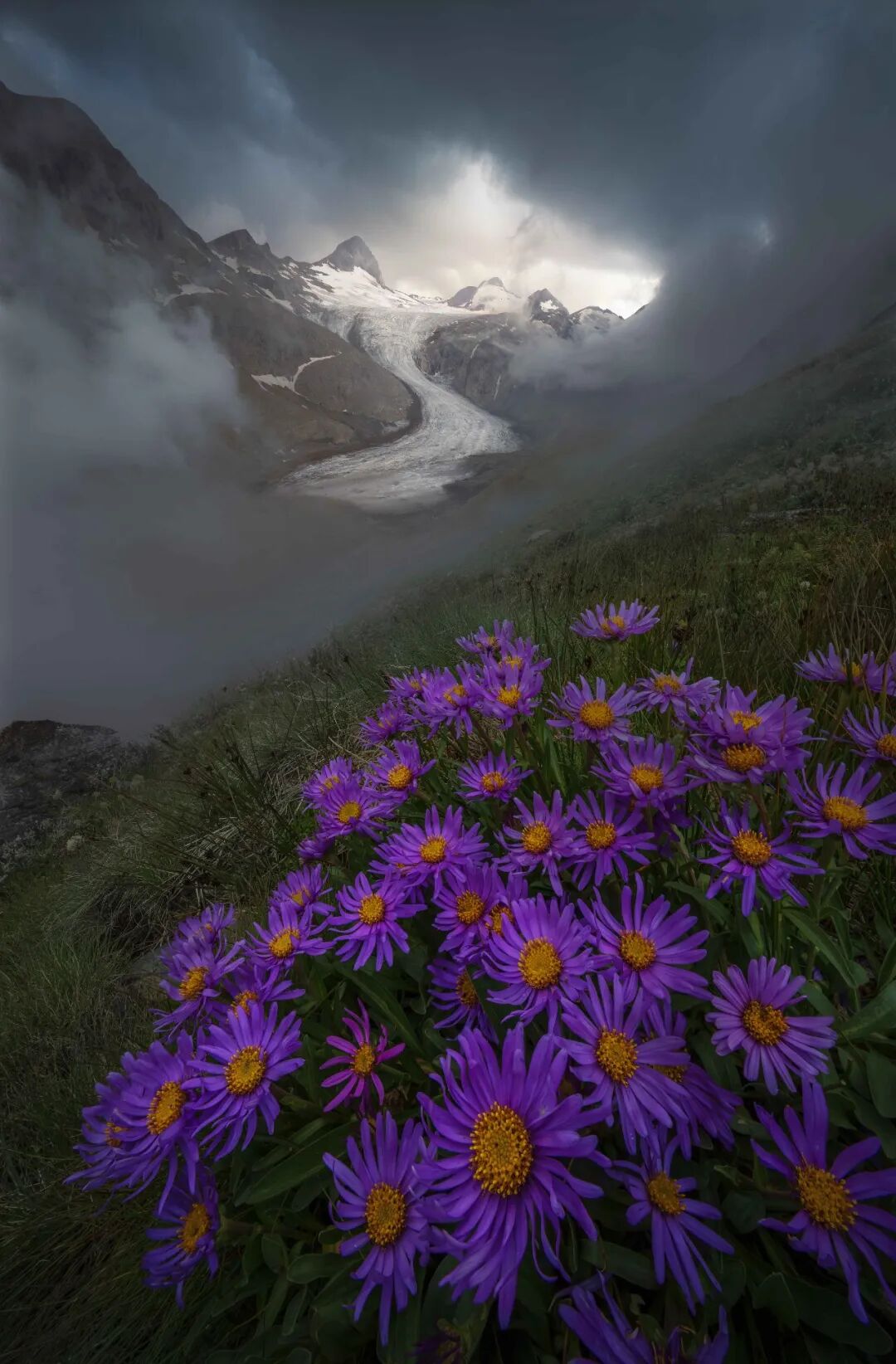 在走完雨天的溪流之后,我在卫星地图上发现了一处s弯小型冰川,结合驴友手机拍摄反馈确定这是一处具有价值和潜力的拍摄点位,由于冰川地带海拔较高,气温往往偏低,意味着哪怕是在八月初这里可能依旧存在花丛前景,且这里几乎少有人知。