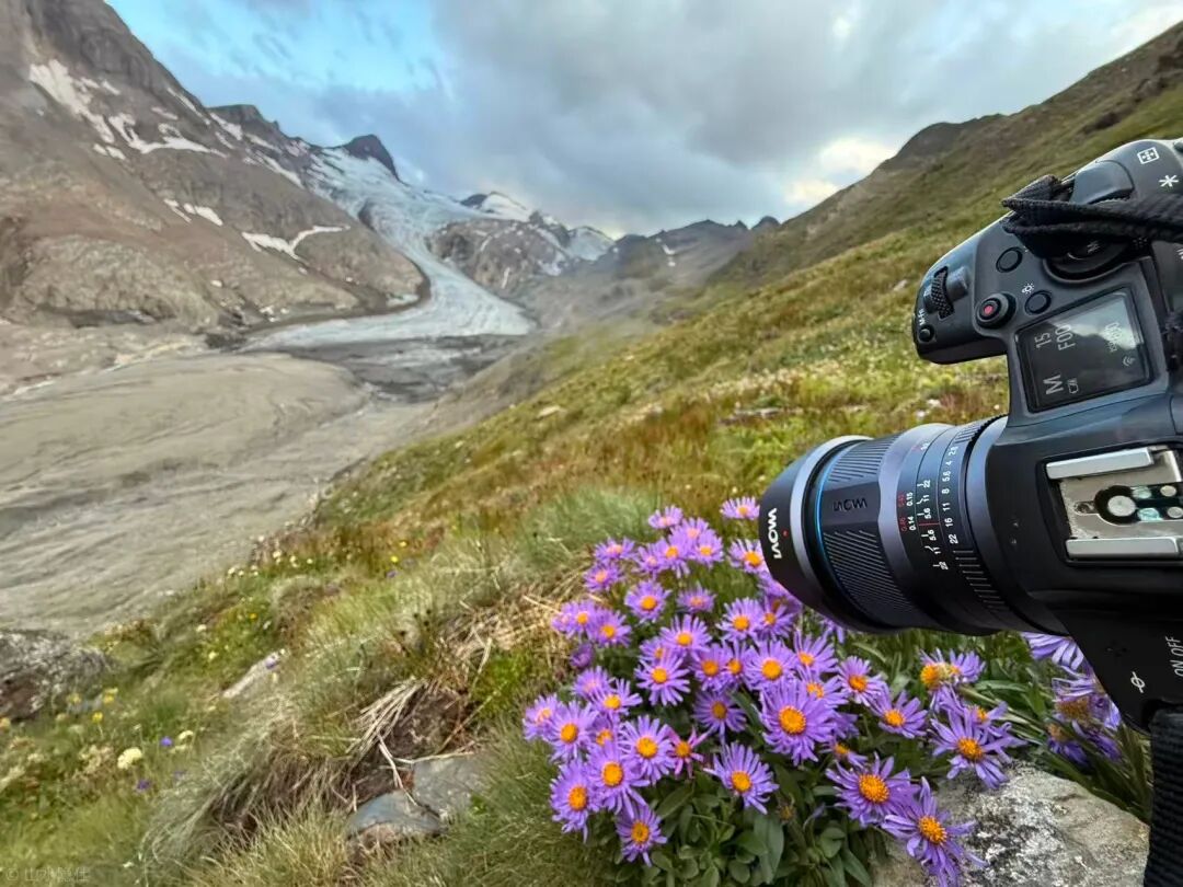 我先后两次到访了这里,几乎在冰川一侧的高山草甸区域上上下下地毯式探索走遍了,好在最后还是找到了还算理想的漂亮紫色小花。从拍摄现场图片中你可以看到实际上镜头贴着前景小花丛非常近,我觉得12mm F2.8这支镜头最让我喜欢的一大特性之一就是最近对焦距离14cm。这比老蛙12-24mm F5.6最近对焦距离又近了1cm。