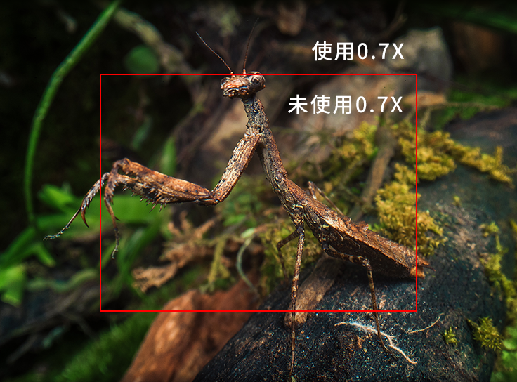 老蛙也有可选配的0.7X减焦增光转接环,适用于APS-C和M4/3相机。转接后,在同光圈拍摄时可扩大通光量,减少焦距。搭配全幅镜头拍摄时,视角不会等效裁切。配合S35电影机上使用可以达17mm焦距,同时光圈增大为T5.6。