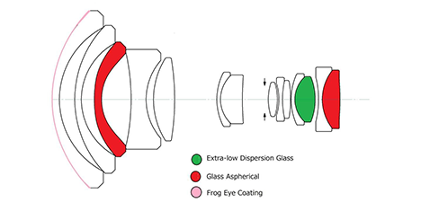 超广角变焦镜头做到体积更小的同时,为了保证图像质量,采用了2枚非球面镜片与1枚异常分散镜片,更大程度地降低了色散与畸变,同时提高了边缘的画质。