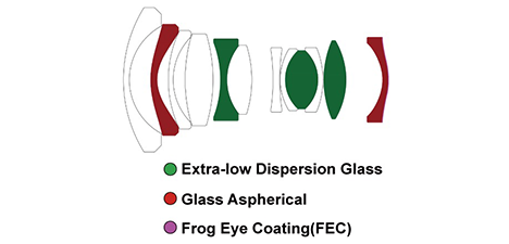 每块镜片均采用低反射多层镀膜工艺,尽可能地消除了鬼影和炫光。为解决超广角大光圈带来的色散问题,此镜头采用了3枚异常分散玻璃(ED glass)大大的降低了色散像差;采用了2片中大口径的双面非球面玻璃,矫正畸变保障高画质;镜头前端第一片玻璃采用了FEC(Frog Eye Coating)蛙眼仿生防水镀膜技术,水滴、赃物、油污不易附着。
