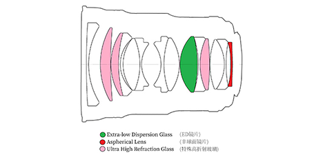 镜组结构采用1枚ED镜片,1枚非球面镜片,3枚特殊高折射玻璃。