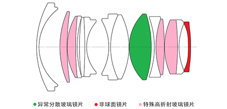 9组14枚(1枚非球面镜片、1枚ED镜片、4枚特殊高折射玻璃) |