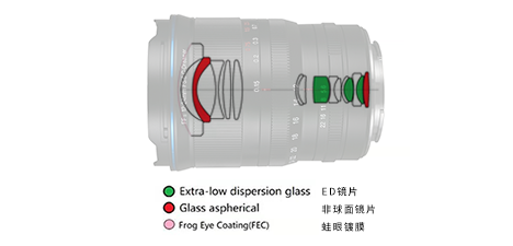 2枚非球面使镜片从画面中心到边缘能够保证优秀的分辨率体现。3枚ED镜片可有效减少色差,避免高反差画面,紫边绿边的产生。