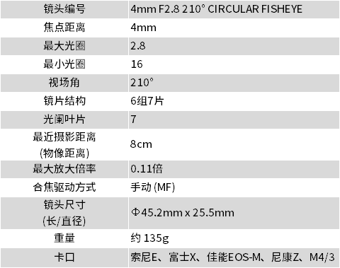 CF 4mm F2.8 210°圆周鱼眼镜头
