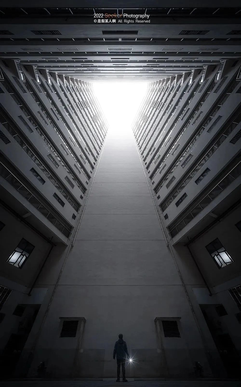 在拍摄这种中空的大楼时,如果只是单纯地向上仰拍难免有些枯燥乏味。我便想到可以把人和楼结合起来拍一张“自拍”,这样看起来也会很有视觉冲击力。老蛙FFII 12-24mm F5.6 C-Dreamer的零畸变设计也减少了我的后期工作量。