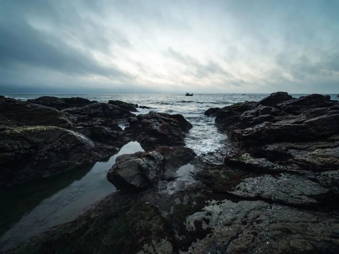在我准备收工往回走时,一小伙恰好登上了礁石,下方水洼恰好能映出倒影,水洼边缘与阴影形成的尖尖恰好能给人带来一些视线引导,远处太阳恰好从云层里冒了个头,于是我得到了此行中真正满意的相片。