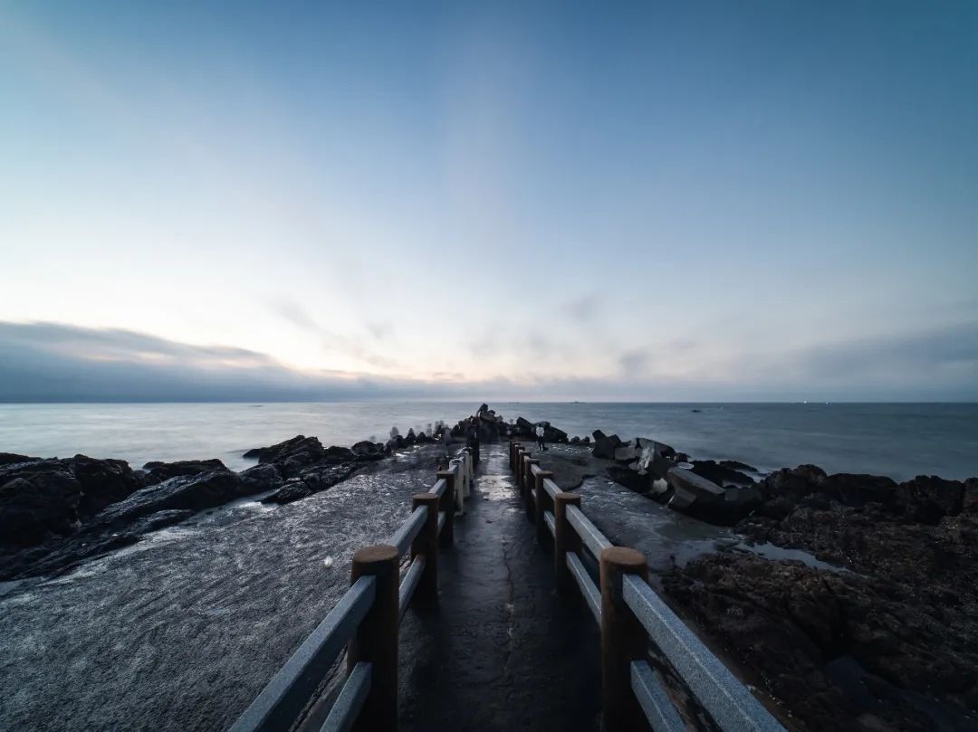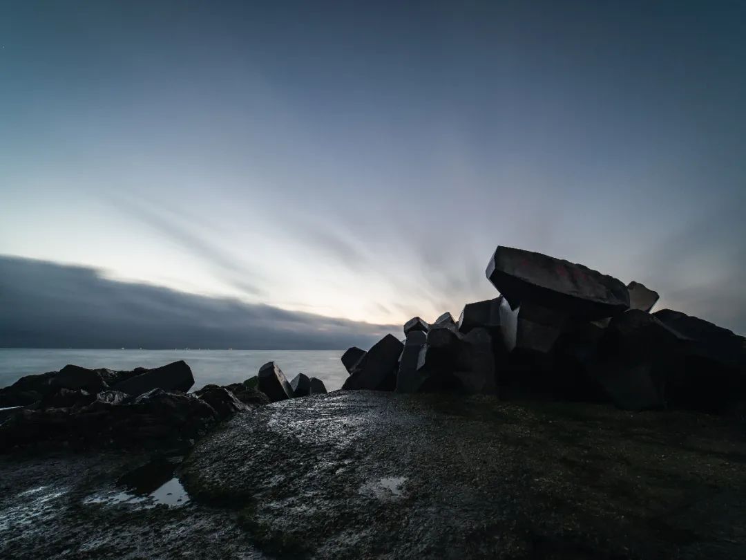 为了用这颗镜头尝试风光,我赶了个大早来到海边。考虑到拍海多少得涉及长曝,还是把脚架给带上了,也是唯一一次。然而用上了脚架的相片并不多,都是在光线还微弱时长曝所得。远处的云层与海平线相接,导致初升的旭日被完美遮挡,无法拍下。