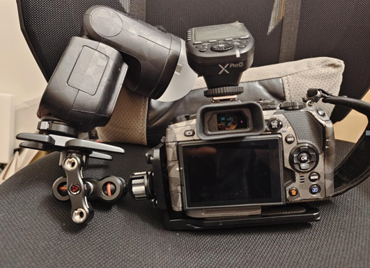 第一,由于镜头太广,我所有的微距闪光附件都会被拍进画面。留给我的体验时间已经不多,来不及再去DIY适用的附件了,最终只能如下图接灯凑合,打光质量堪忧。