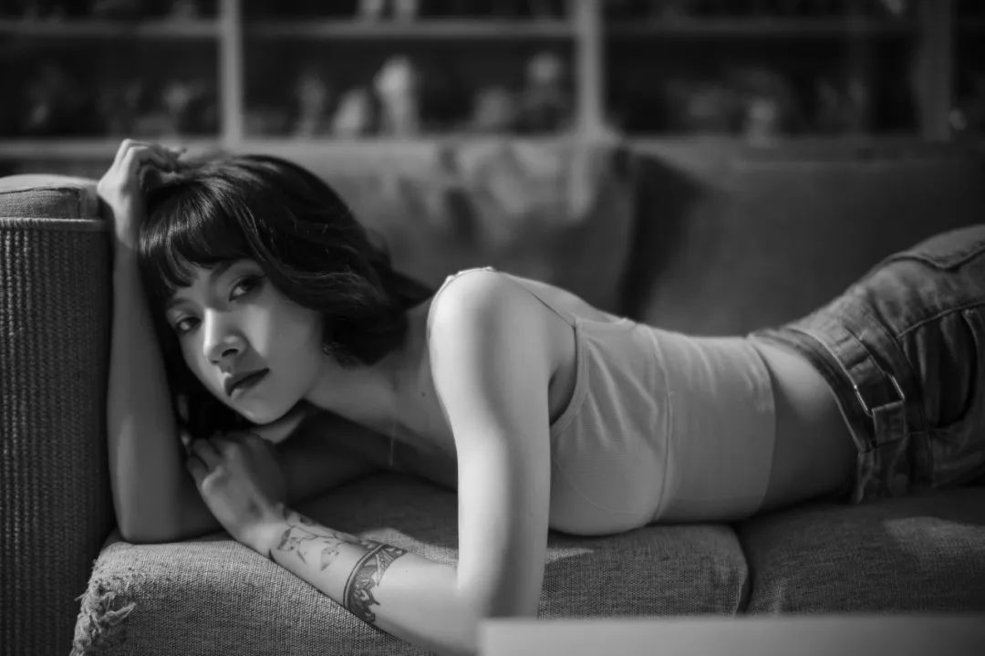这一组画面是在室内弱光环境拍的,我只开了客厅的吊灯,让光源离模特有一定的距离,考虑到镜头略重且机身防抖并不起作用,我使用了脚架以方便我手动对焦。这支45mm F0.95镜头的氛围感还是很不错的。