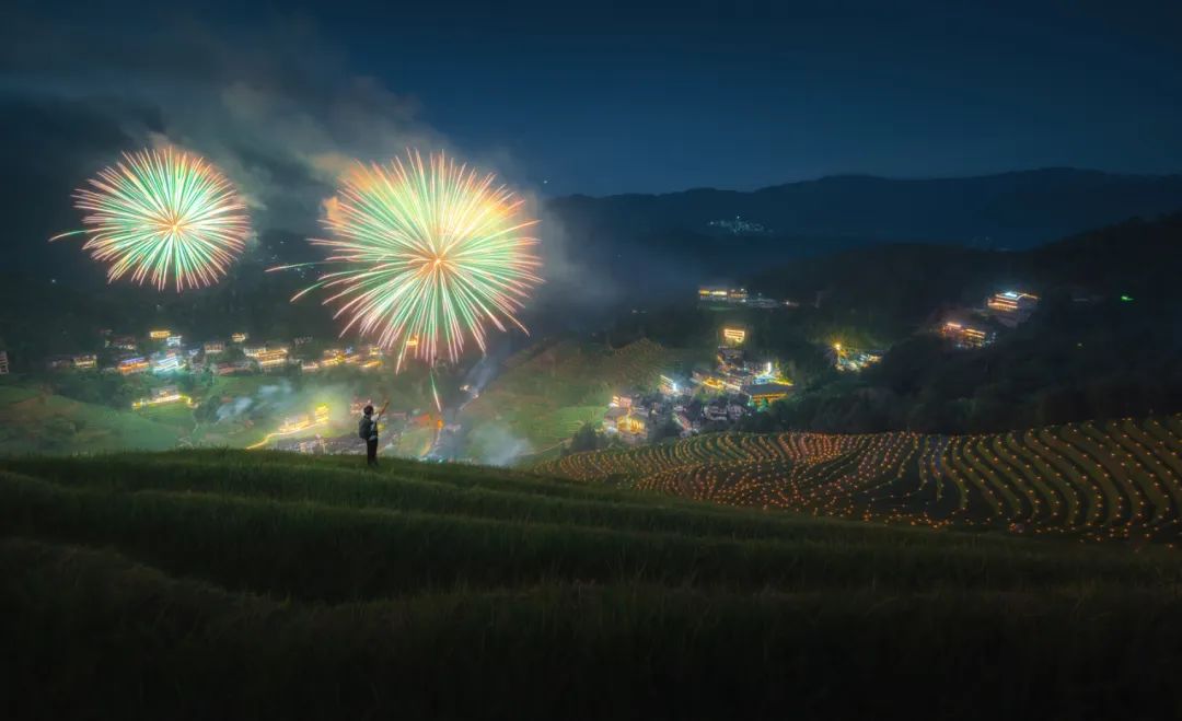 龙脊梯田在白天已经壮观无比,但在夜晚,它展现出了不同的魅力。星星闪烁,山脊在月光下若隐若现,这是一个完美的夜晚风景。而且,正巧我来的时候,还有烟花表演。夜晚摄影充满挑战,但也提供了创作的机会,我此刻与光影合影。我尝试了长时间曝光来捕捉烟花的轨迹和梯田的光影效果,这枚镜头的最小光圈F3.5让我能够实现夜景低iso拍摄,获取低噪点画质,让夜晚的龙脊梯田更加神秘和迷人。