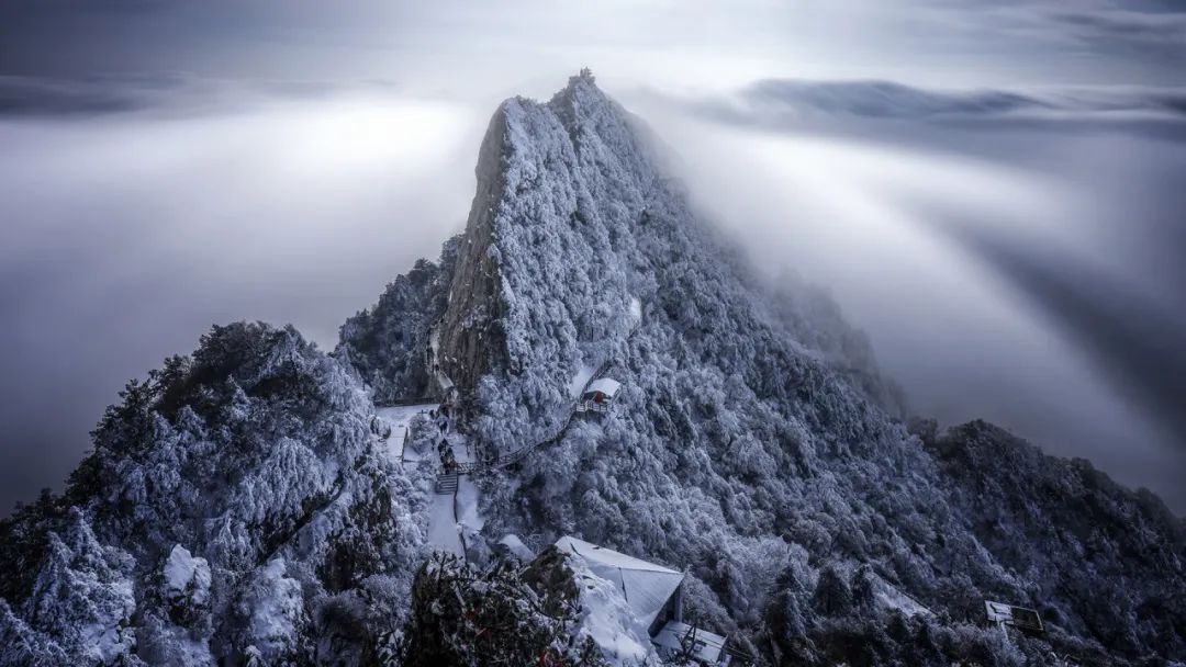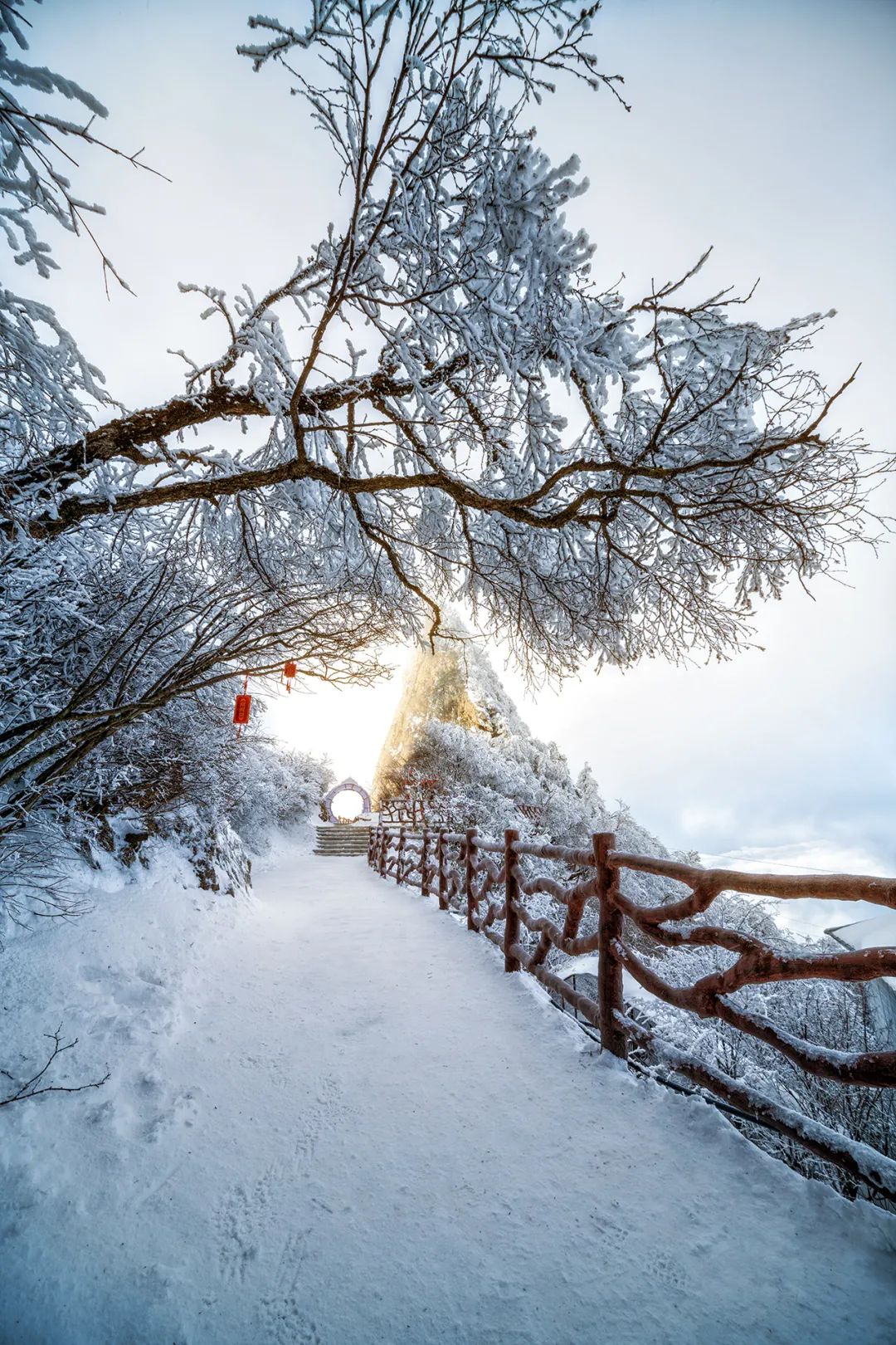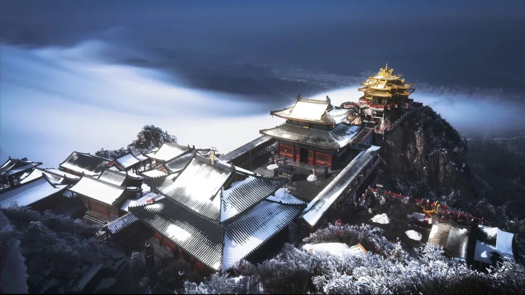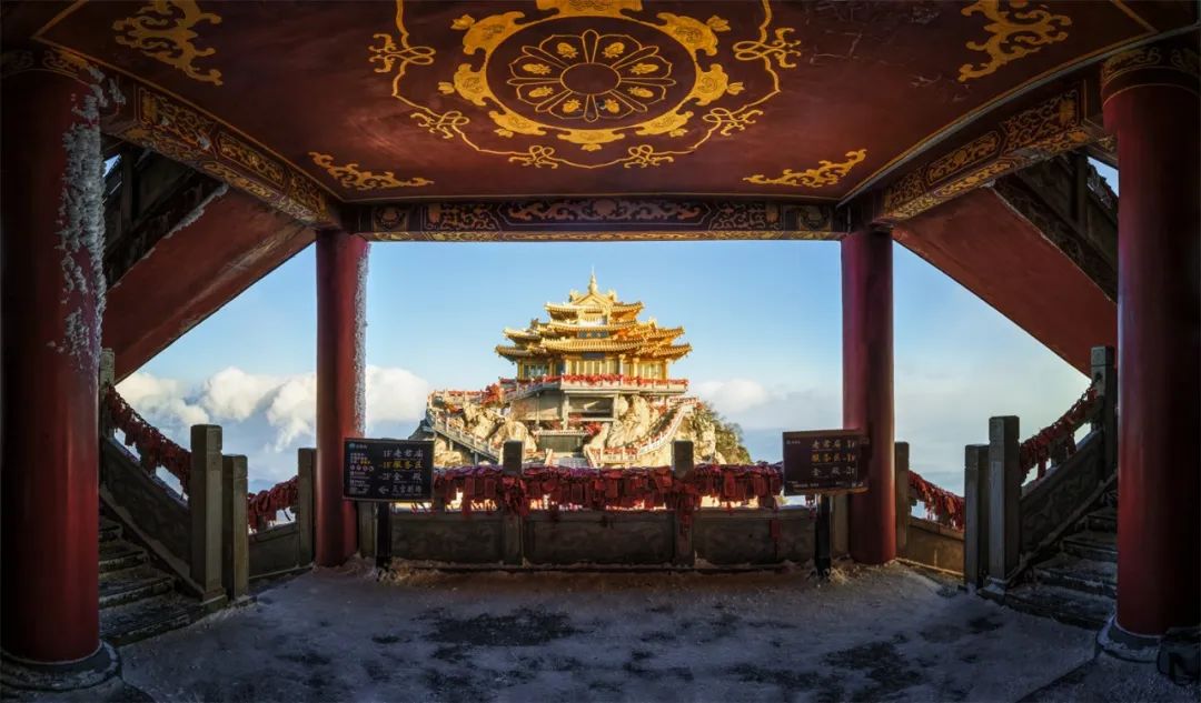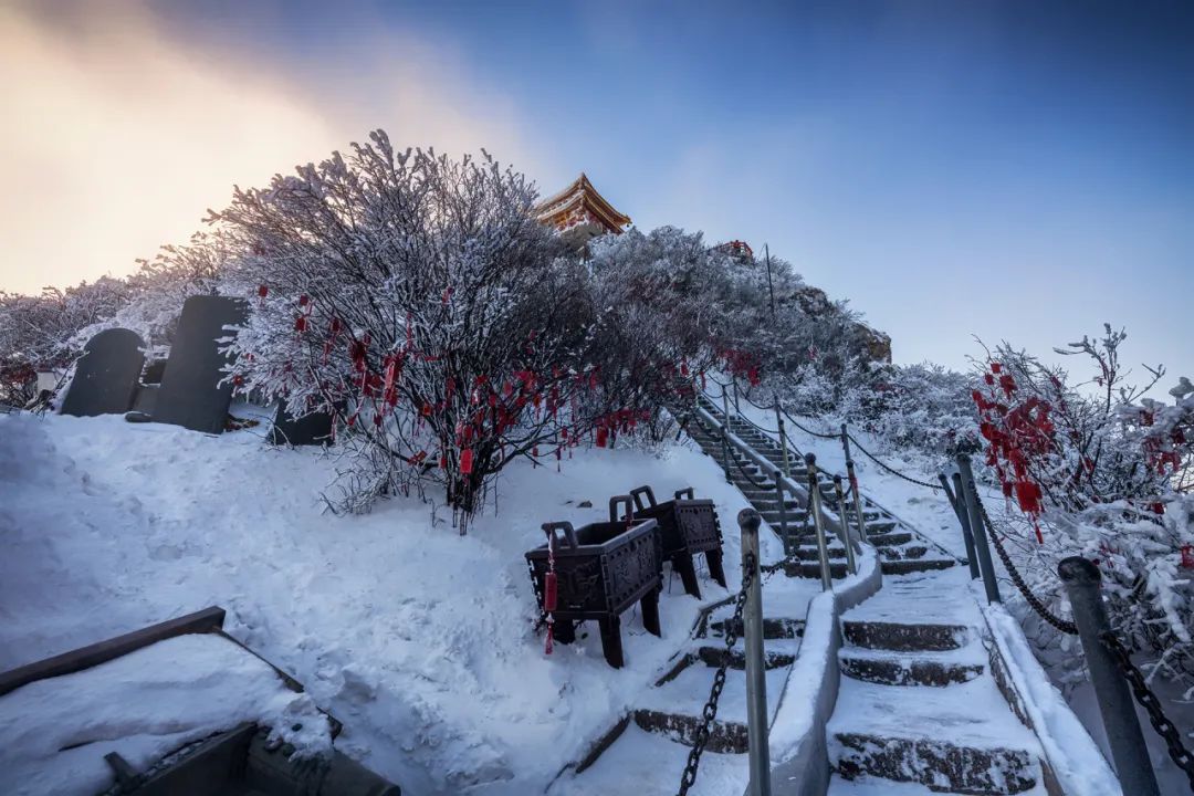 来到金顶道观群,抬头便被眼前的景色震惊:抬头望去,延绵的石梯伴着铁链,一直延伸到亮宝台,道路两侧,碑鼎静静地矗立在雪中,细听着枝桠与铁链在风中的呢喃,彷佛亘古如此。远处日出照耀下的金晕,伴着蓝色的天空,这一幕让我难以忘怀。