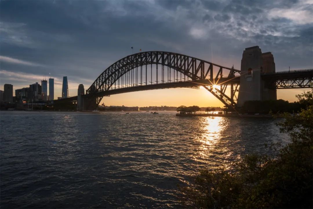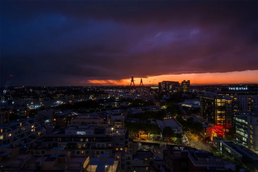 太阳渐隐,记录下一张带雨瀑的晚霞,图中间的桥为悉尼安萨桥。