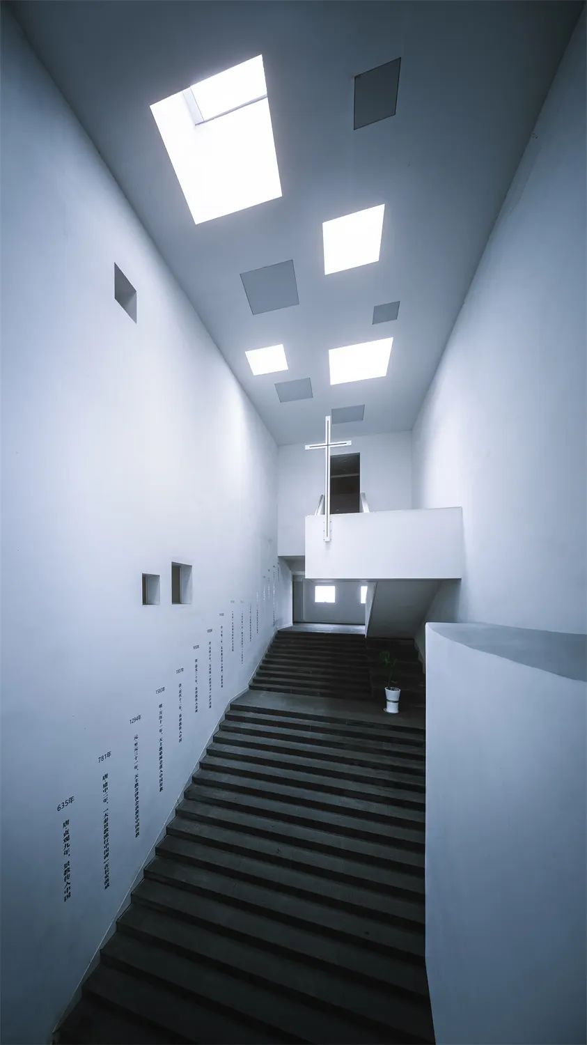 在相城基督教堂,也是可以凭借10mm的极限超广角,带来全新的视角冲击。位于视觉焦点的三组独立台阶,分别位于入口处的半室外前厅、轴线引导的大厅尽头以及十字轴的正中,同时这三组台阶通往二层区域及主礼拜堂。