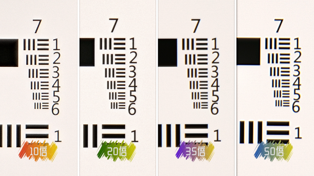镜头的解析力也同样是非常重要的光学素质之一,我拍摄了测试显微镜物镜用的分辨率板,这组镜头可以轻松解析最小的元素。下图为10X—50X倍率下镜头呈现的测试效果。