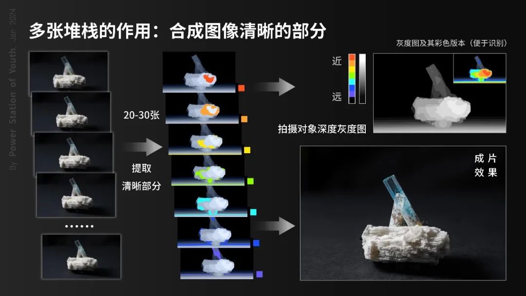 在微距条件下,图像的景深是非常浅的。景深通常可以理解为画面中“清晰”部分的深度——比如在一张由广角拍摄的风光照片中,景深可以轻松地达到米级,而在微距拍摄中,景深通常只有毫米级或微米级。因此,我们需要通过多张堆栈的方式进行拍摄。每张照片记录物体清晰的一部分,并利用后期软件自动识别每张图片中“清晰”的部分,并适当缩放匹配后合成为一幅清晰的图像。下图呈现的就是微距拍摄中景深合成的全过程。