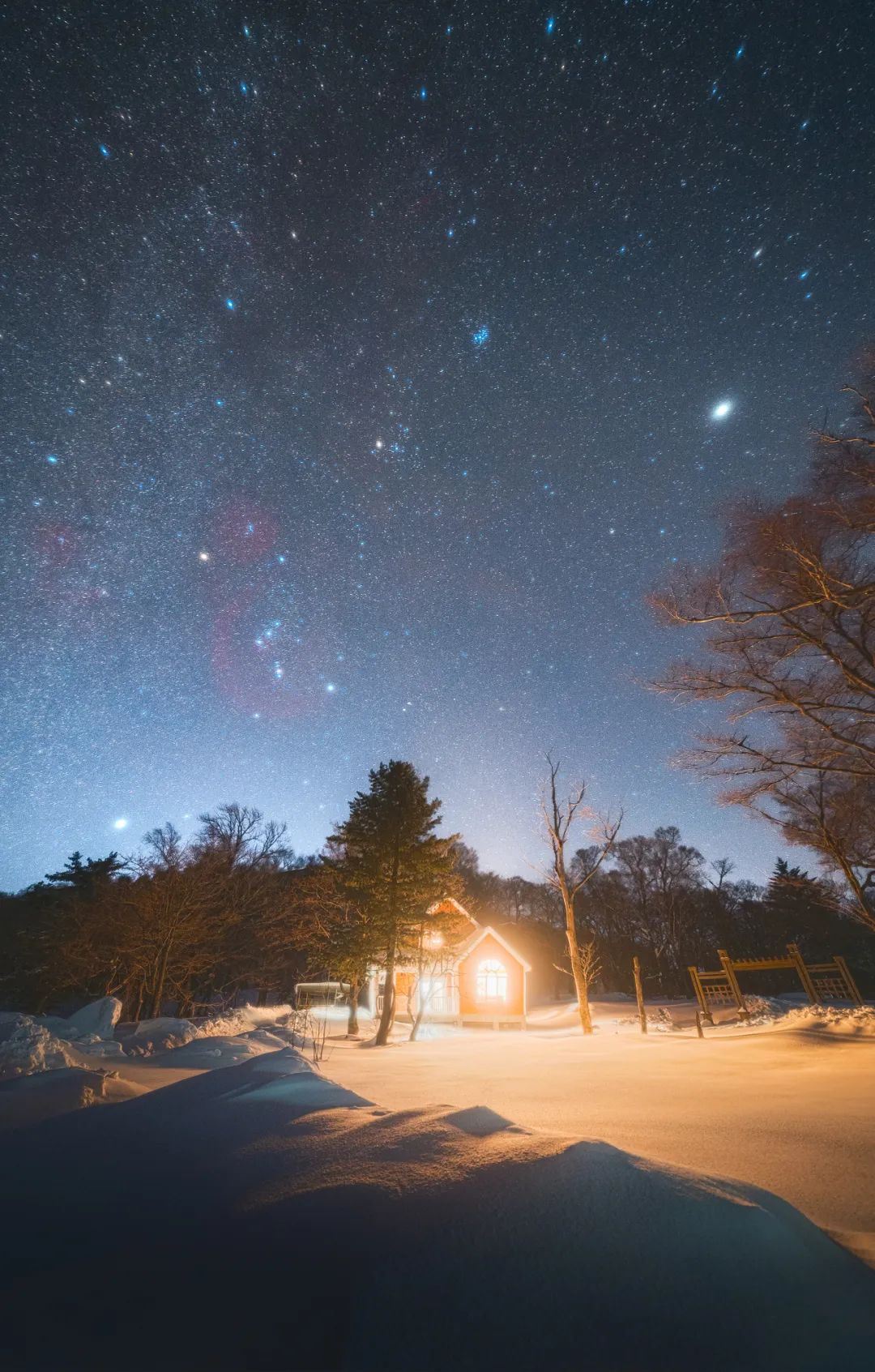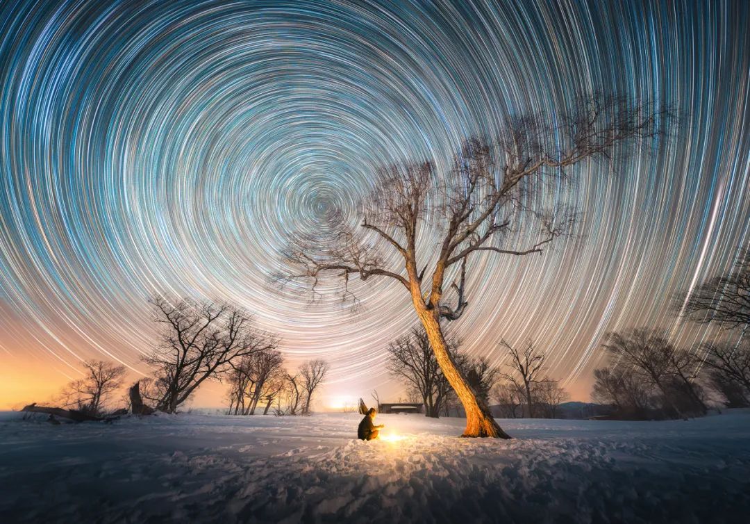 即便没有雾凇,四方顶子上方的星空也一样精彩。旅者坐在雪地上烤火,四周的枯树延伸向北天极,是对星河流转的顶礼膜拜,天空中的星星们富有激情地划出了时间五彩斑斓的痕迹,为寂静的寒夜增添了些难得的活力。