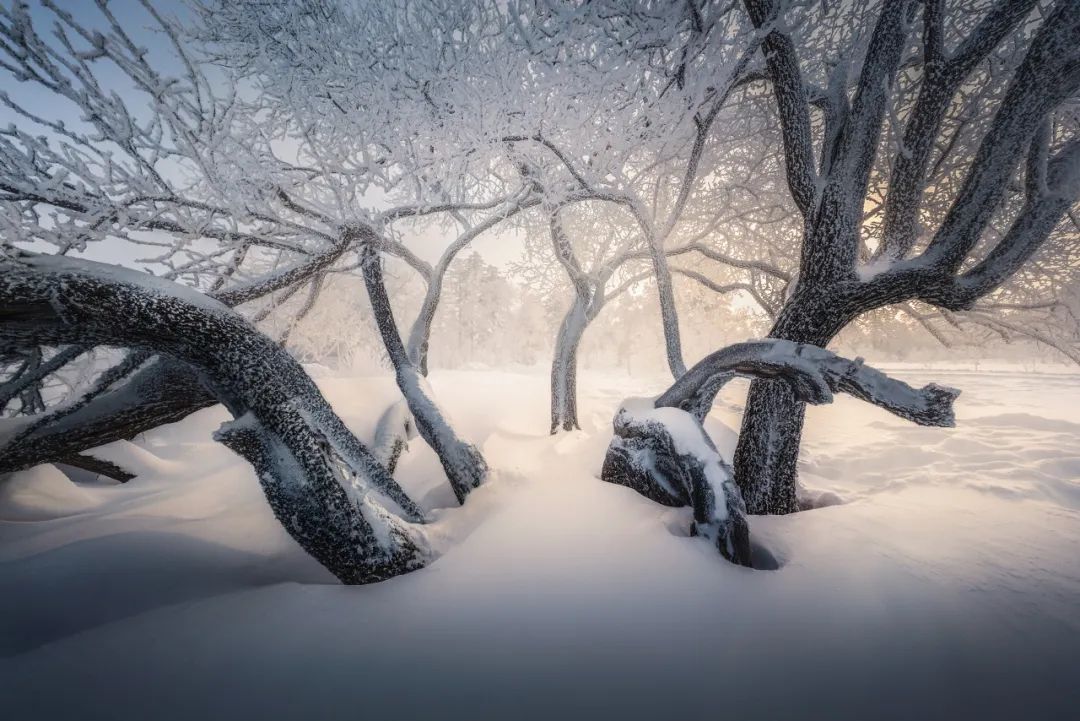 在雾凇岛,我有幸遇到了一场绝美的雾凇,但弥漫的大雾将整个岛屿笼罩起来,视线极其有限(能见度10米不到)。雾凇岛平坦而开阔,岛上有许多棵孤独生长的树,以往人们都会选择从远处使用中长焦镜头进行拍摄,但在雾气弥漫的情况下就不可取了。而得益于老蛙10mm最大视场角130.4°,使我能够最大限度地靠近被摄对象,减少浓雾的影响,在这茫茫雪原中完整的记录下这一份“孤独”。
