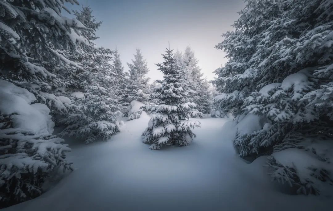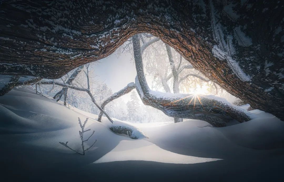 在雪岭的探险中,我遇到了一棵“张牙舞爪“的树,这棵树在雪地里格外引人注目,像是一个长满触手的雪怪从地下苏醒。使用老蛙10mm F2.8镜头,我得以从一个极具包围感的视角捕捉这一独特景象,宽广的视角让这棵“雪怪”树的每一个细节都得以展现。