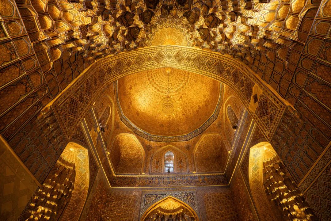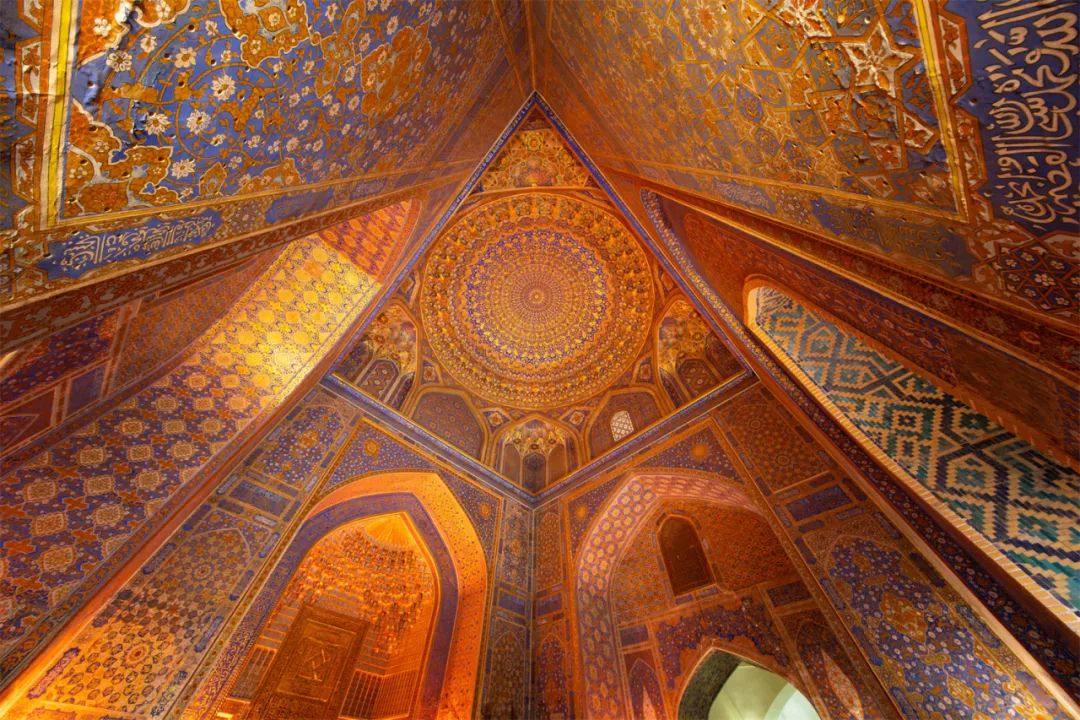 上图拍摄于撒马尔罕雷吉斯坦广场中央的清真寺内部,其装饰非常华丽,一派金碧辉煌的景象。我选择贴靠一侧的墙角向上拍摄,线条呈放射状向穹顶汇聚,呈现出特别的美感。