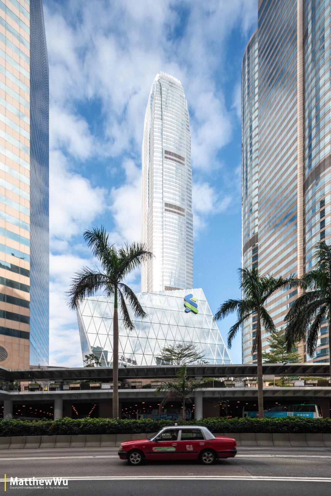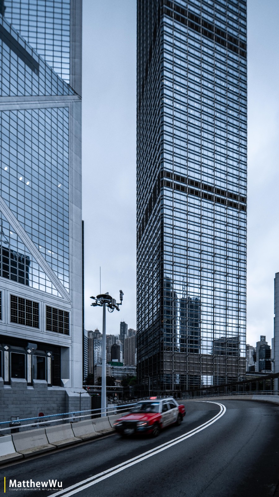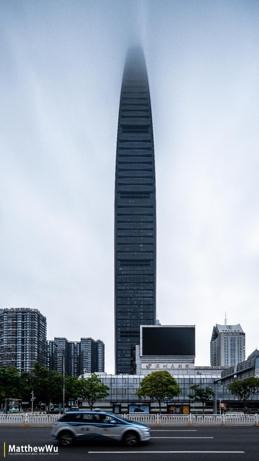 位于深圳市中心,这张画面同时需要兼顾建筑与下面的路面。我将镜头下移,使得更多路面能被拍到,正好远处的云霞中透过一束光,便记录了下来。
