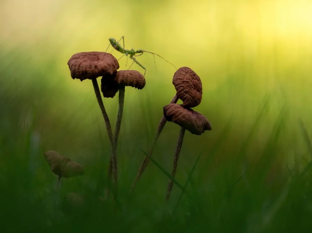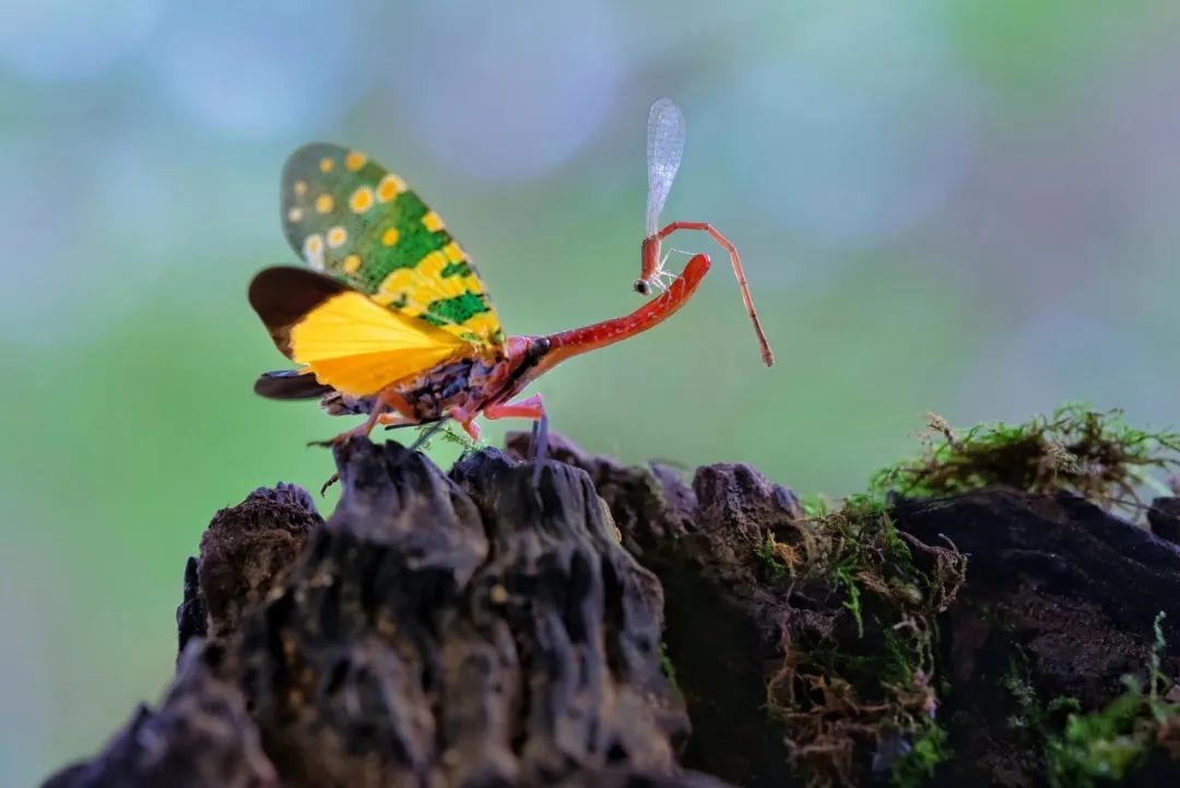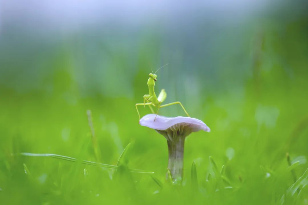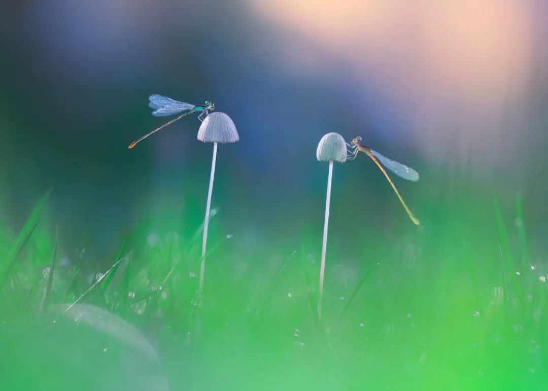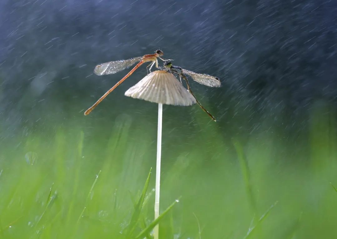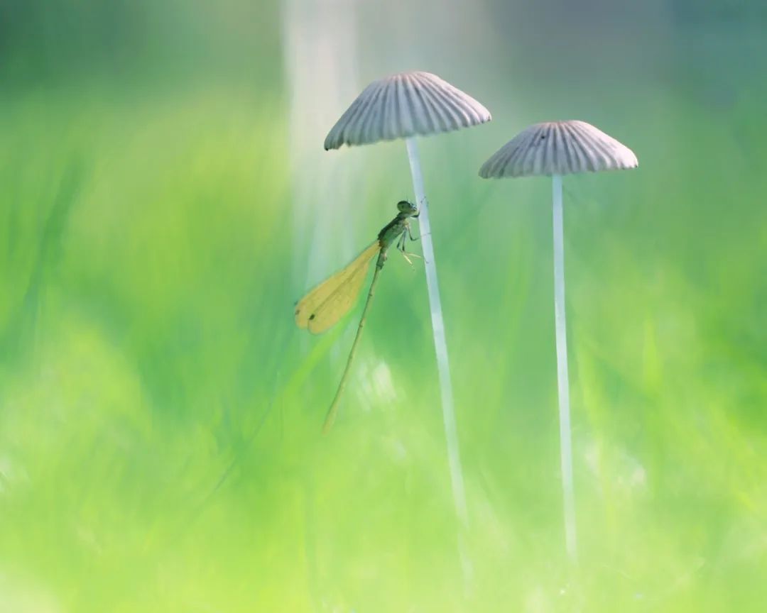 在我所有的微距摄影作品中,我最喜欢的是这张雨天的相片《依偎》,在蘑菇上强壮的豆娘抬起胳膊给弱不禁风的豆娘遮风挡雨的画面。这张拟人化的画面,像极了人类的母爱。它传达了一种温馨、浪漫的情感。每当我看到这张拟人化照片时,都会被大自然中这种无私的关爱和呵护所感动。这幅充满生命力和故事感画面让我深刻体会到大自然的美好与和谐,也让我更加珍惜身边的一切。