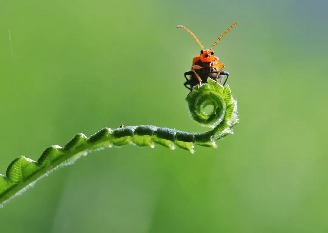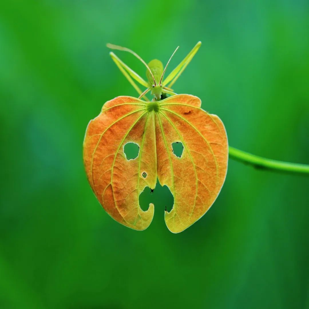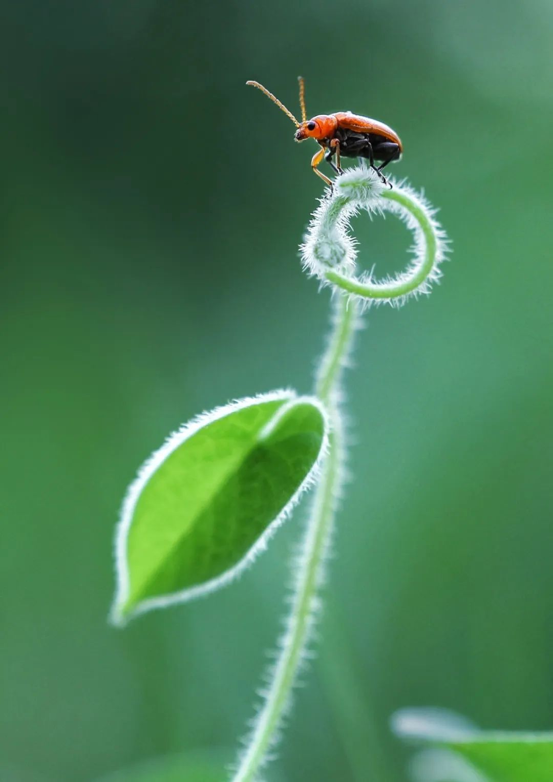 老蛙镜头的选择让我在拍摄微距时有了更多的想法,可操作性强,而且最高2倍放大倍率,不论是昆虫触角的状态,还是叶片的纹理都能很清晰的呈现。这张图是一只昆虫站在叶片的枝干上,昆虫像天线一样站立的触角十分可爱,卷曲的枝干透过光也能看见细细的绒毛。