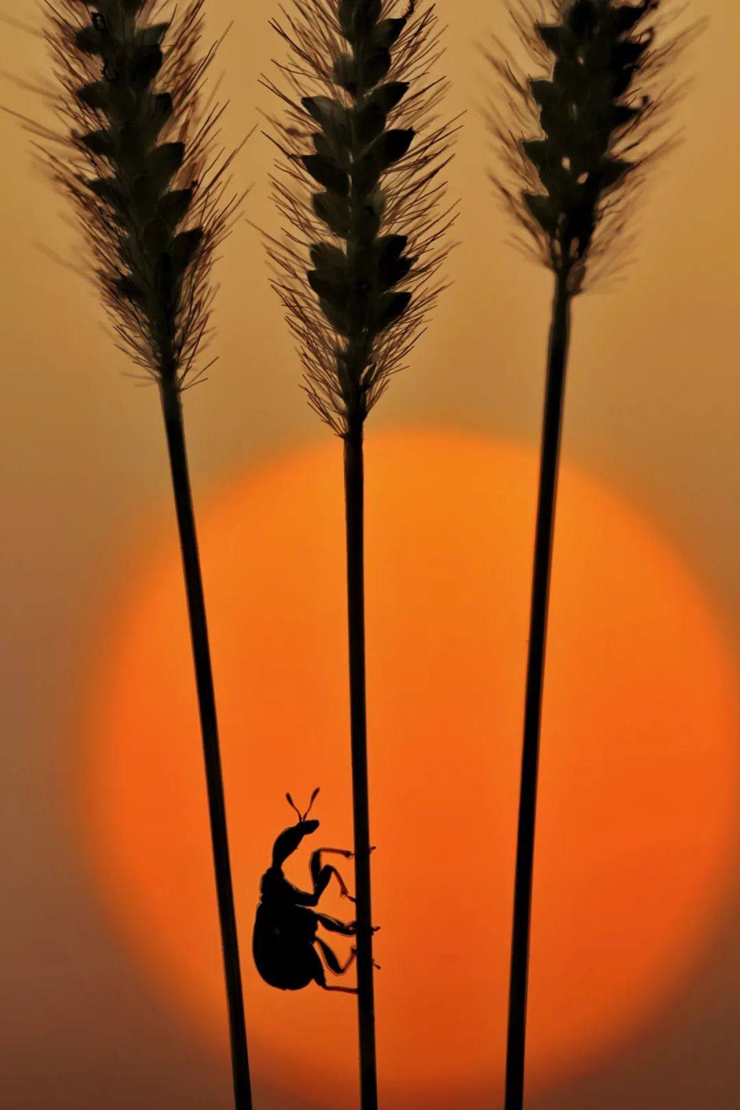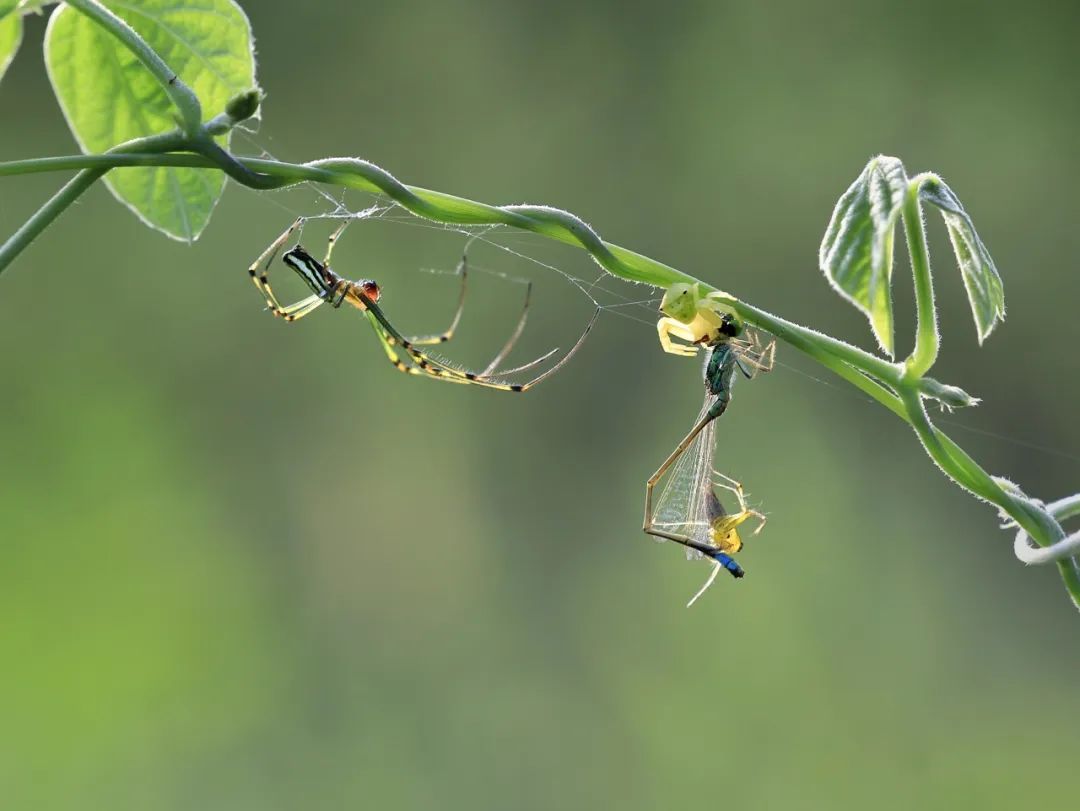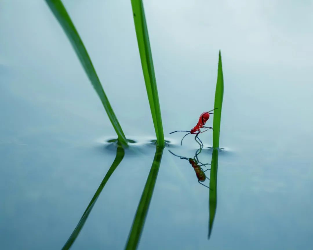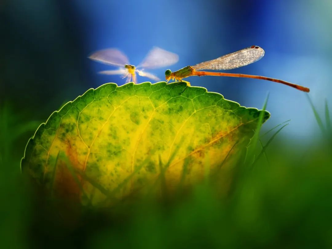 在拍摄过程中,我遇到过许多有趣的事情,但最令我印象深刻的还是那次拍摄叶子时发生的意外。一片落在草丛中叶子,镜头捕捉到透过逆光叶子的纤毫纹理,正准备按下快门时一只豆娘突然飞入画面,紧接着又飞来了一只豆娘。它们之间的互动仿佛是大自然特意为我安排的模特,让我有幸捕捉到了这个美妙的瞬间并起名《邂逅》。这张照片不仅展现了微观世界的生态和谐之美,也让我深刻体会到了微距摄影的魅力所在。