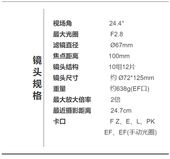 - 卡口:佳能EF、佳能EF(手动光圈)、RF、尼康F、Z、索尼E、L、宾得PK