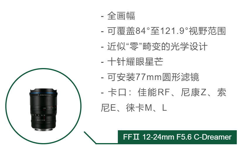 老蛙这颗FFⅡ 12-24mm F5.6 C-Dreamer超广角镜头完美解决了这个问题,不仅涵盖24mm这样的普遍广角端,而且可以一直变焦到12mm这样的超广焦段,并且F5.6的最大光圈可以说专为风光摄影的超广角场景量身打造,为了平衡景深与画质,往往在使用超广角的经典构图场景时,我们并不需要太大的光圈。