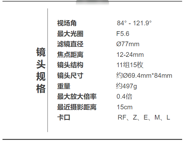 12-24mm F5.6这颗镜头在兼顾12mm的超广角的情况下与F5.6的光圈组合完美的解决了日间超广角场景的所有需求,而且体积很小重量也仅仅不到500g。