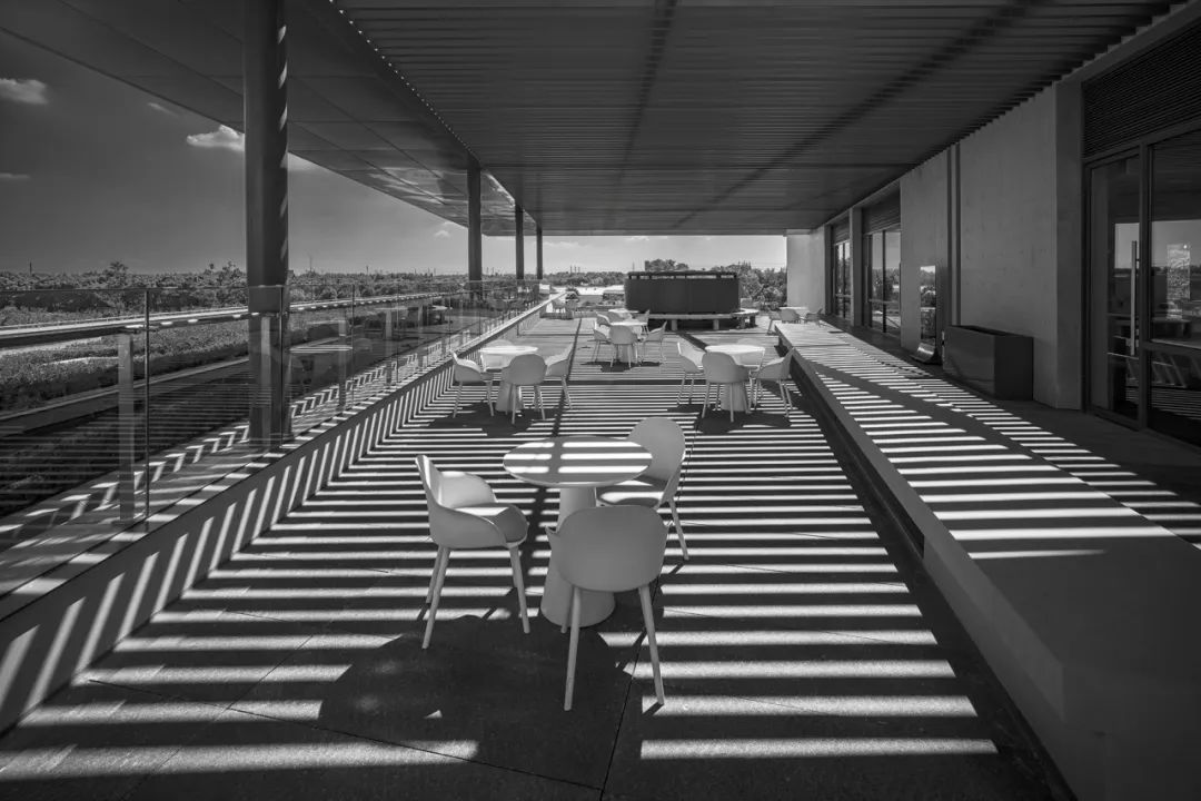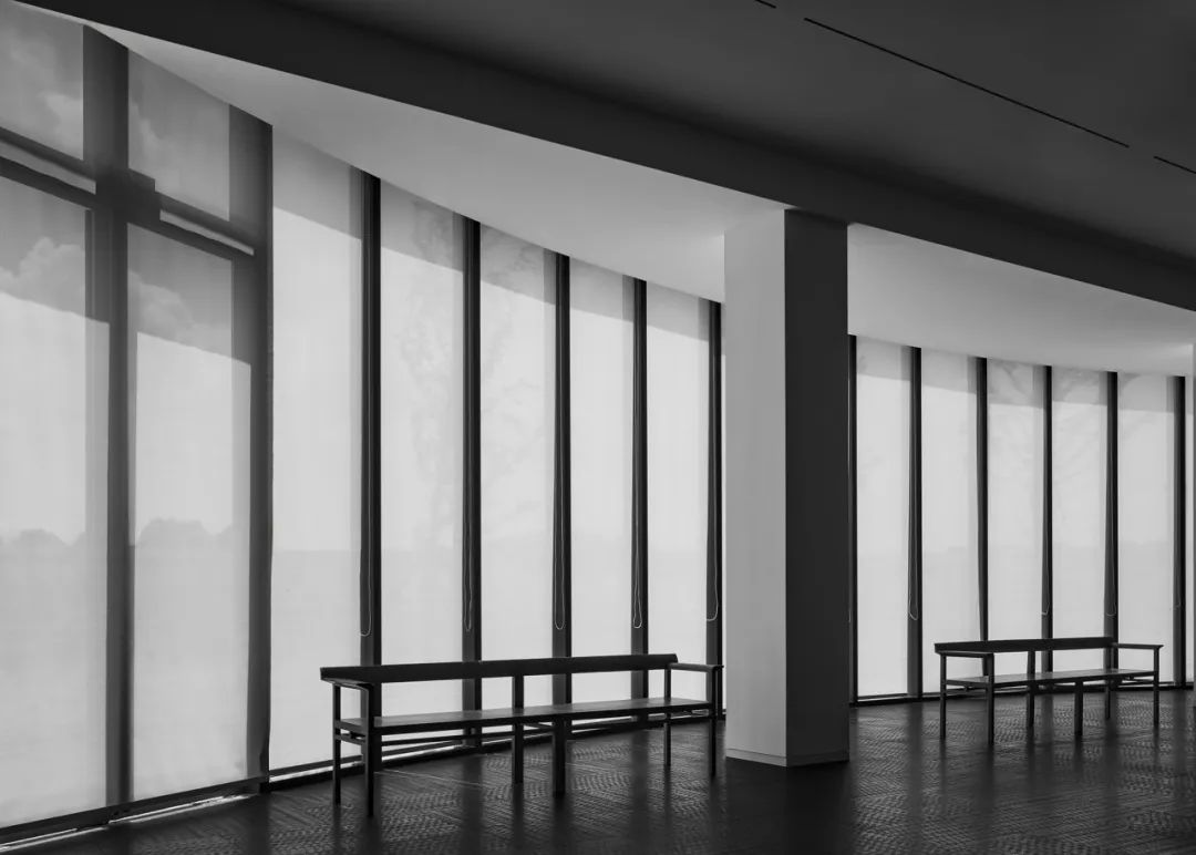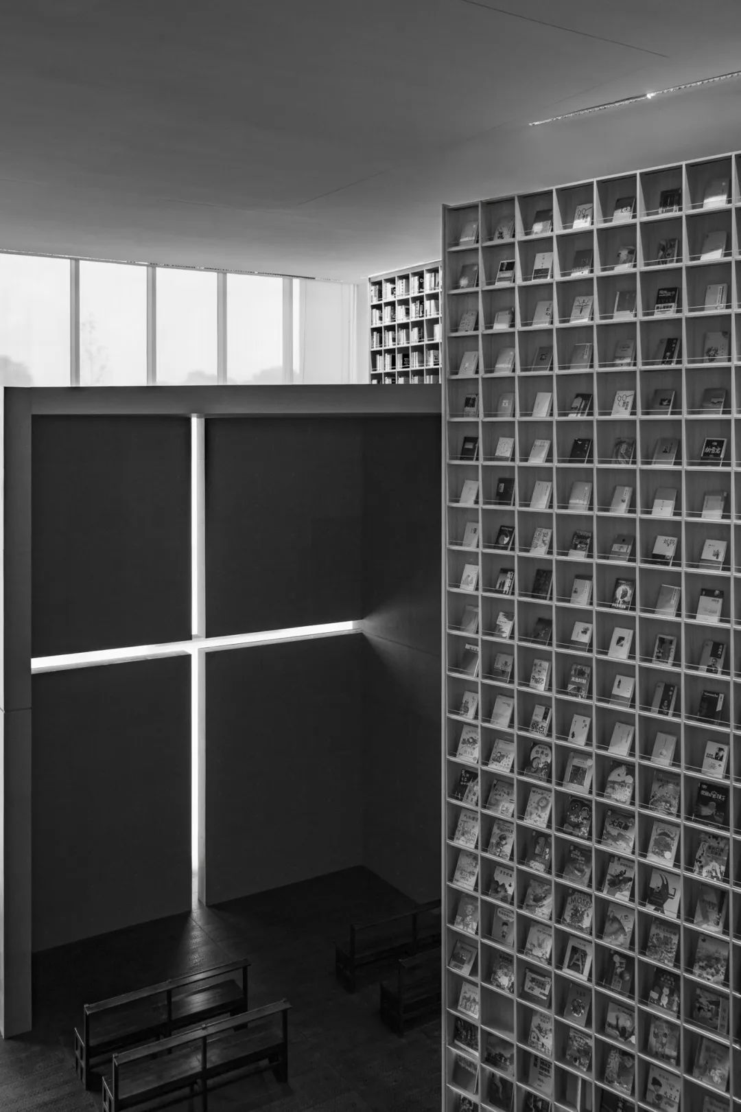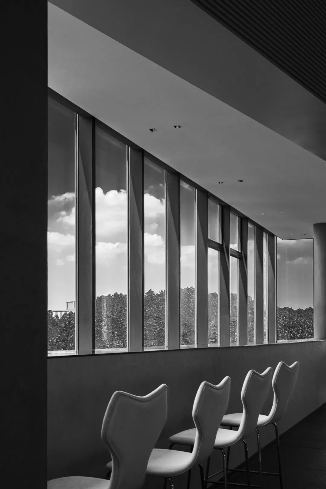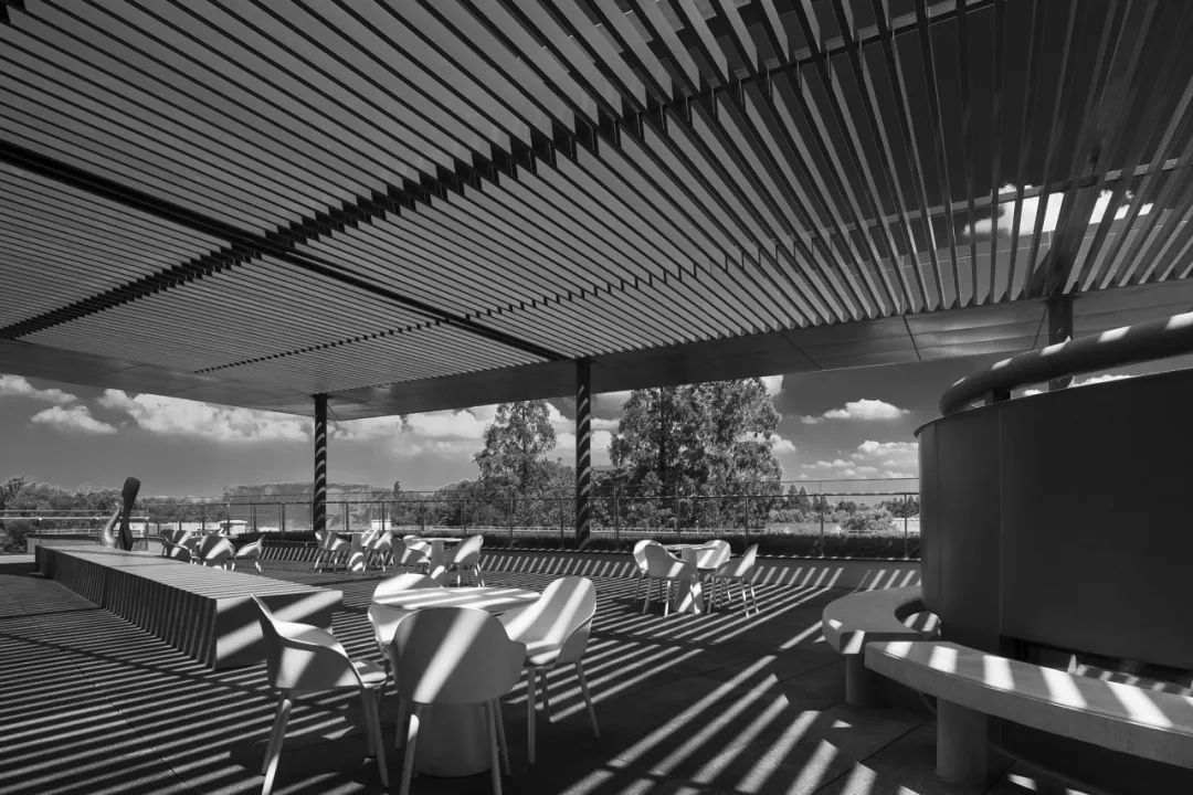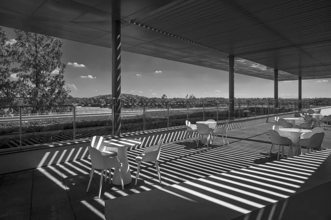 站在露台上面,看着一望无际的阡陌绿野,又感觉其实这是一个面向自然的大看台。露台之上,只是两排休闲的座椅,阳光下光线效果却非常独特,延伸了宽阔步梯带来的神圣感。
