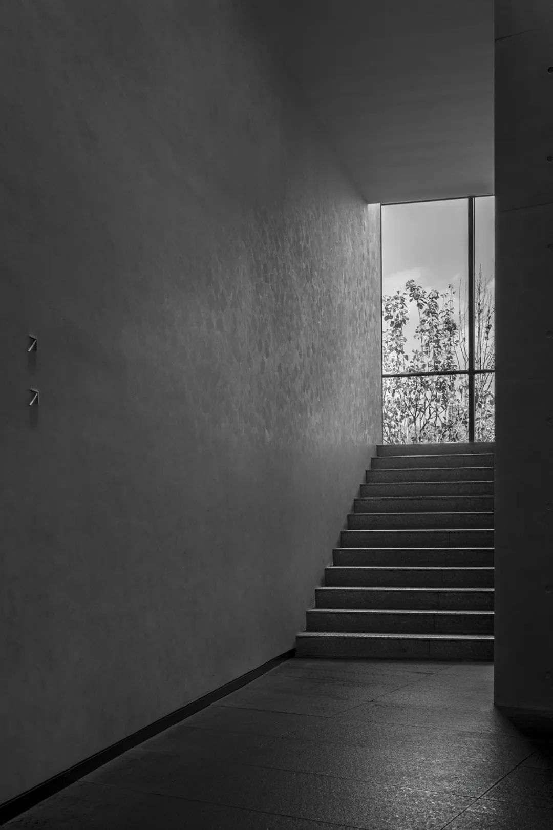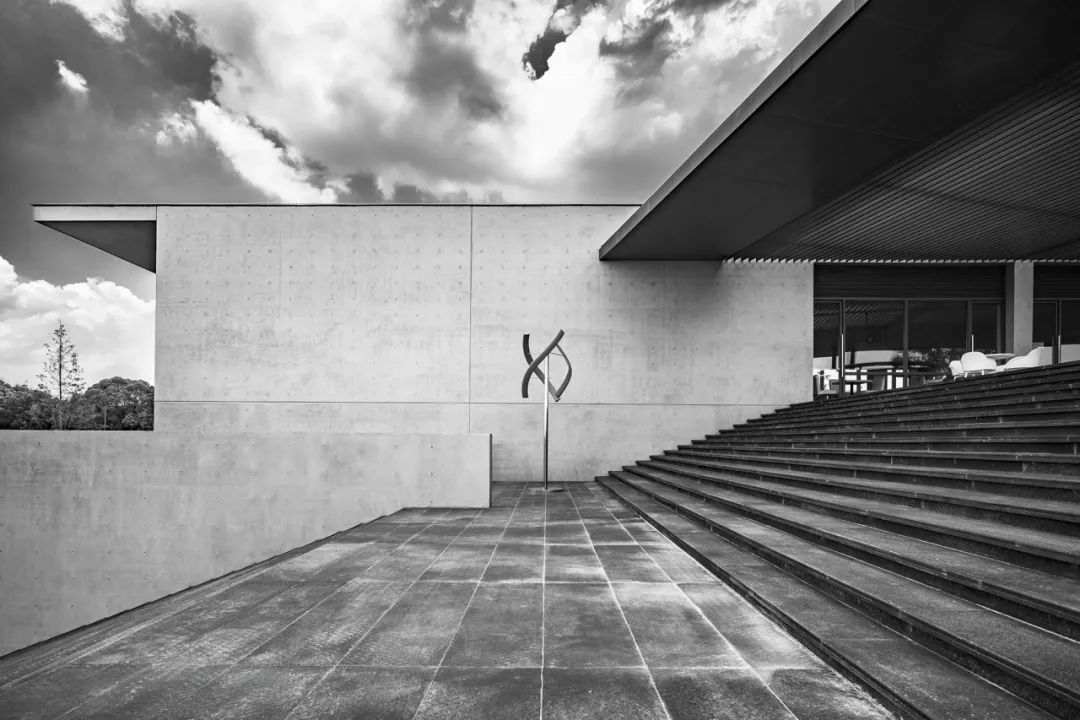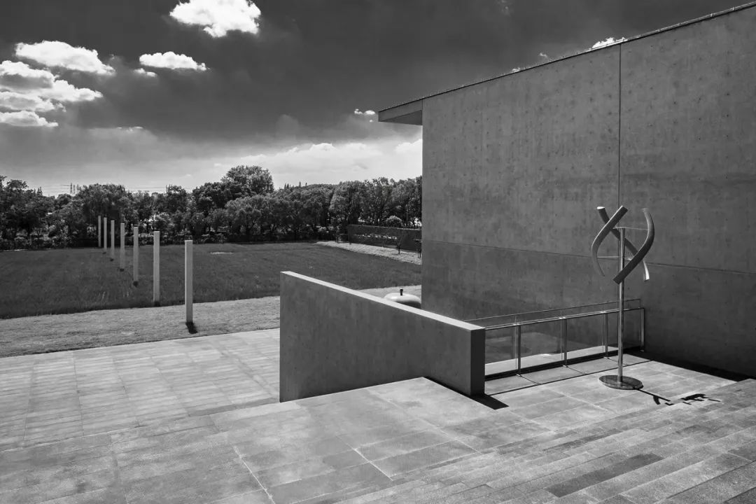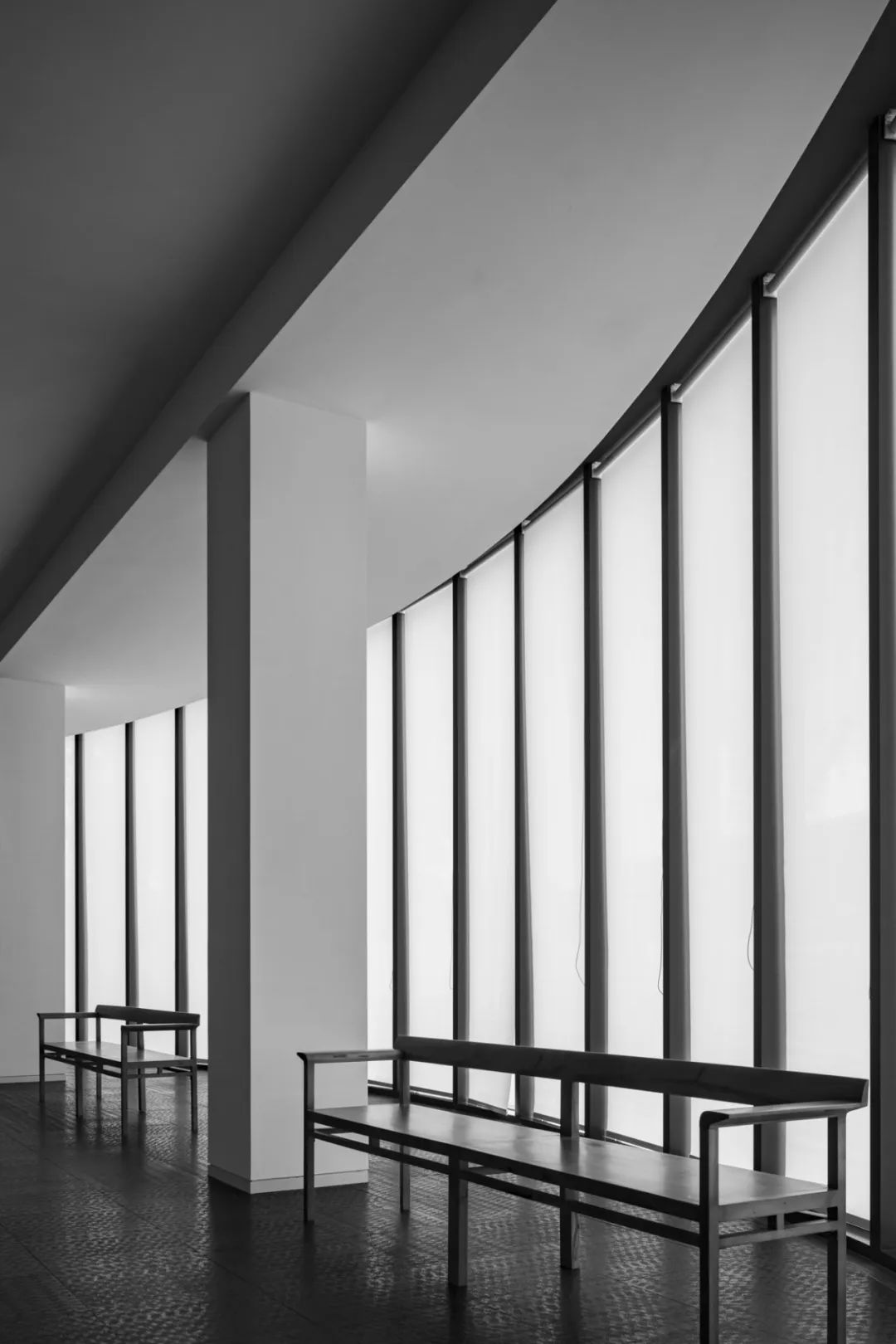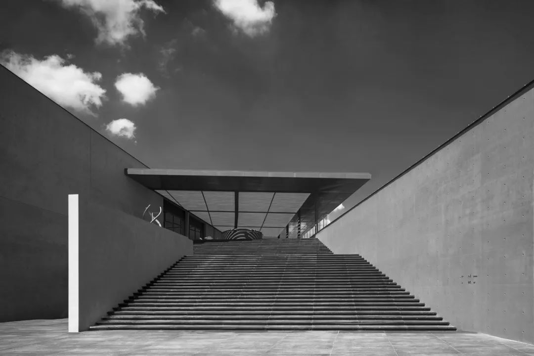 美术馆外侧是一排水泥柱引导视线到达美术馆的中线位置,形成神秘的仪式感。