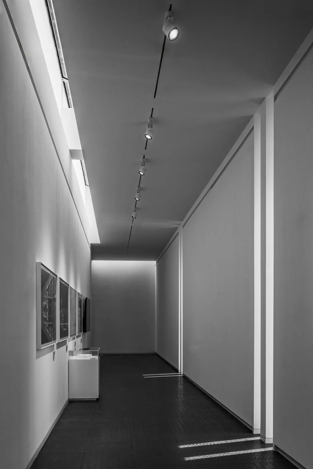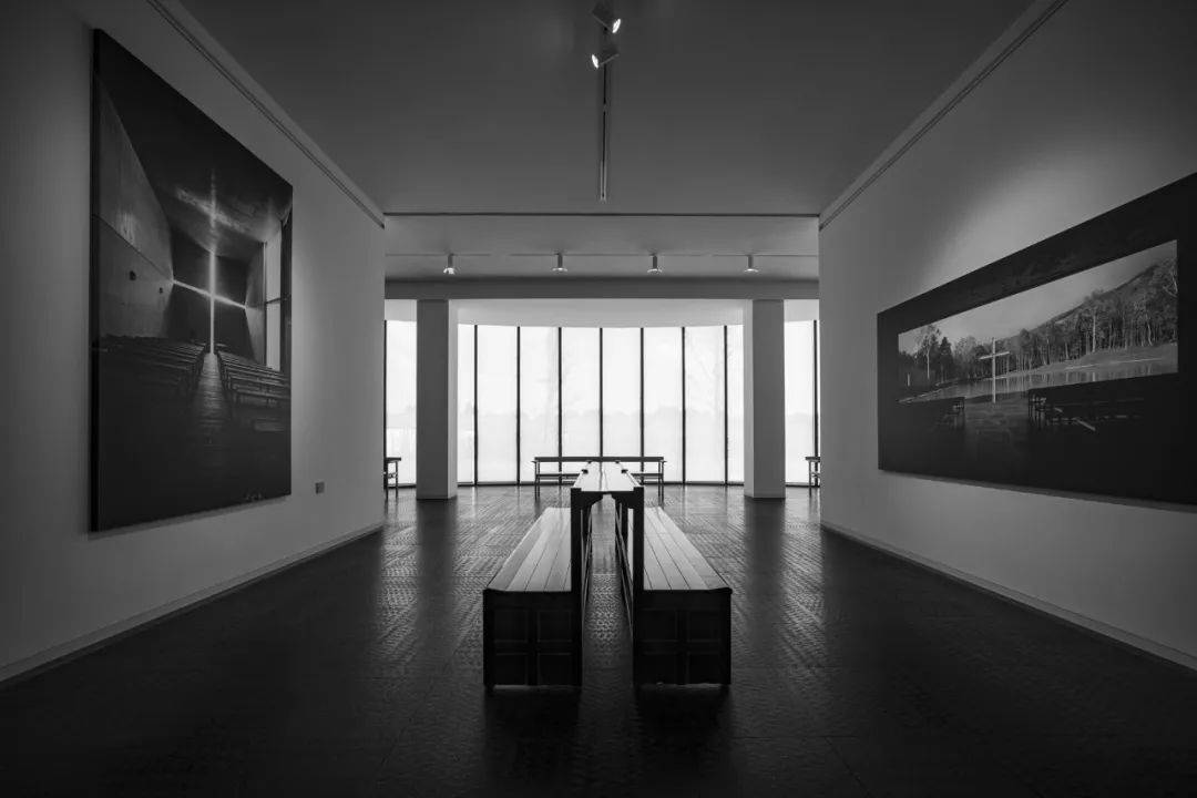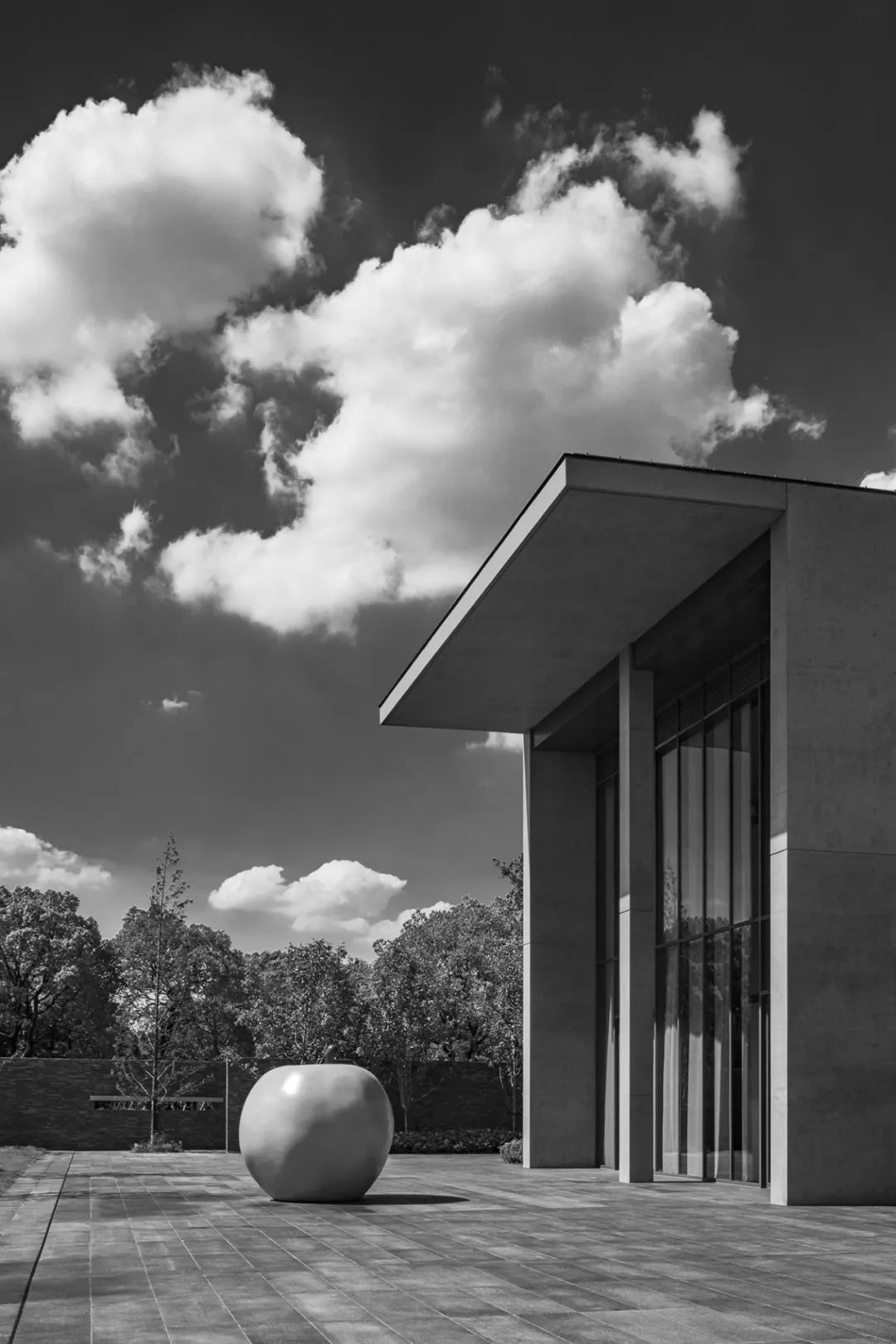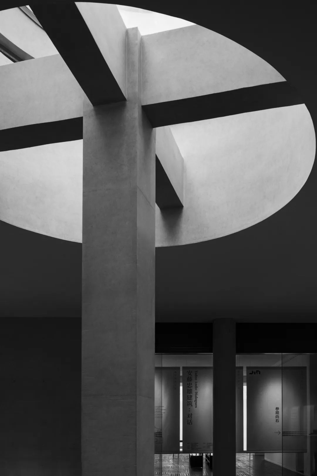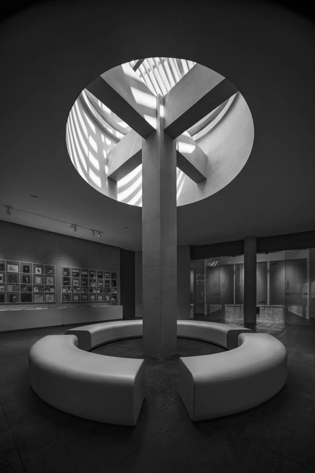 美术馆外侧是一排水泥柱引导视线到达美术馆的中线位置,形成神秘的仪式感。