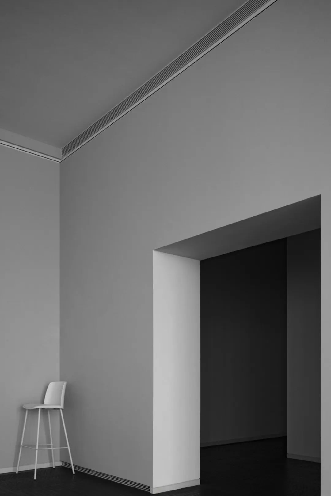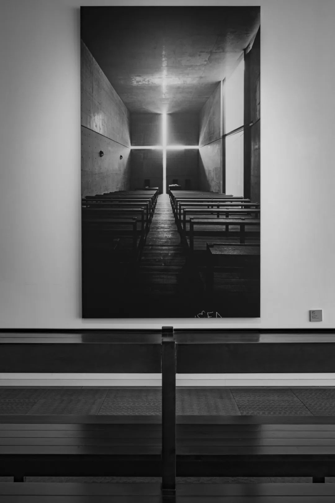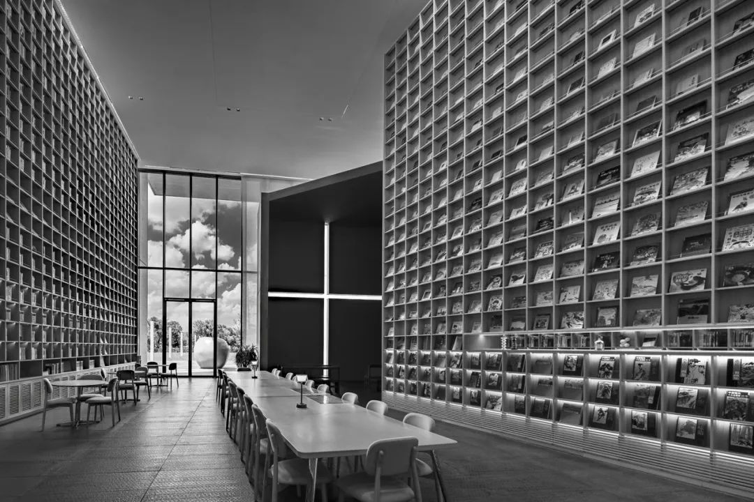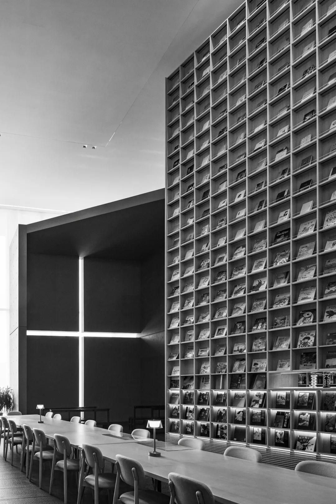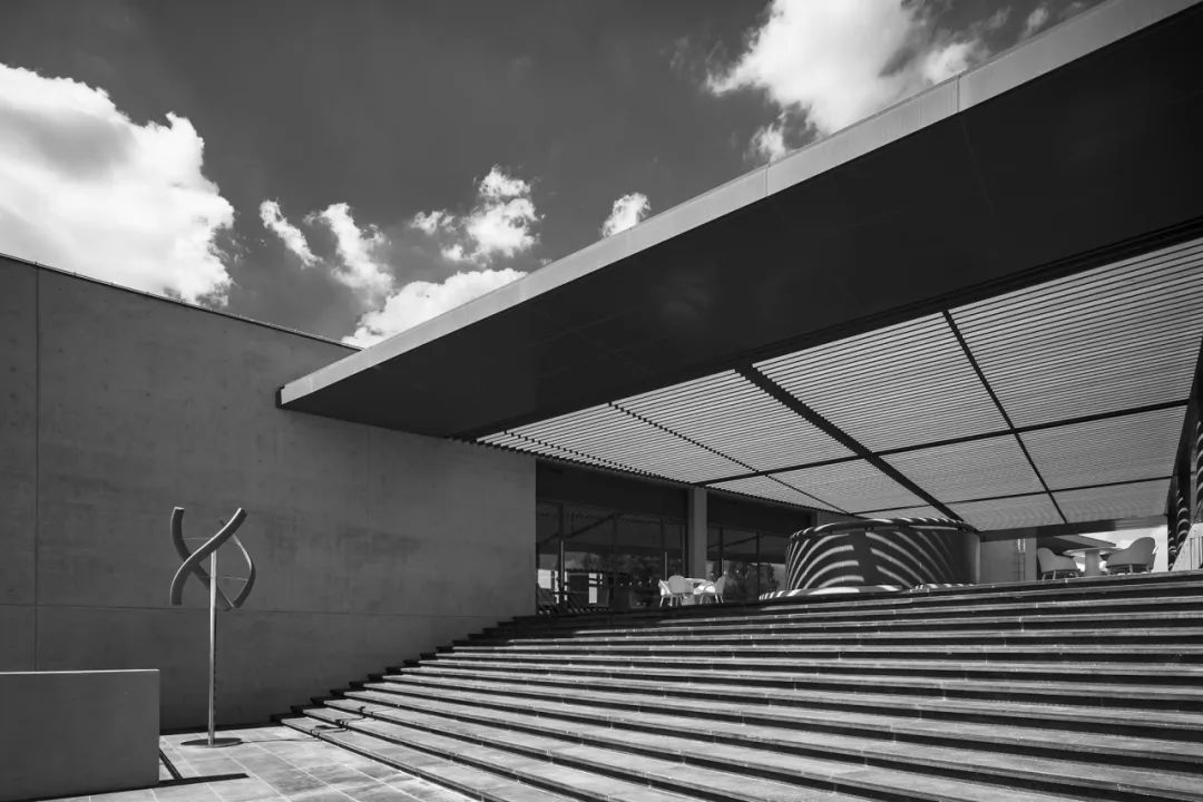 美术馆外侧是一排水泥柱引导视线到达美术馆的中线位置,形成神秘的仪式感。