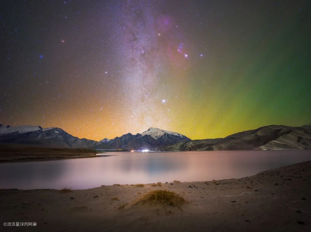 在帕米尔高原白沙湖畔,拍摄夜间公格尔峰背后五彩的气辉波纹与黄道光。
