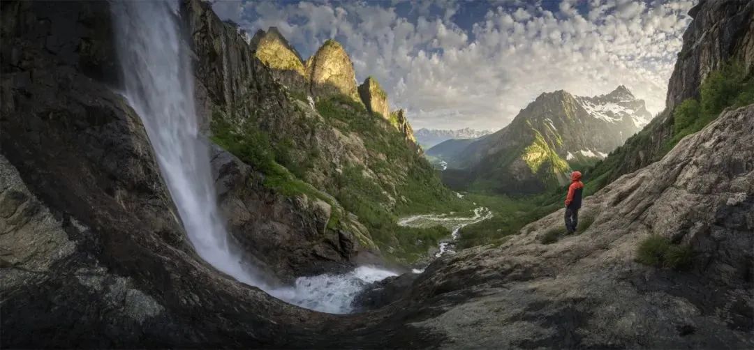 格鲁吉亚高加索山脉六月七月是格鲁吉亚高加索山脉的花季,在深入雪山脚下的草甸区域开满了各种杜鹃及黄色花丛。如果仅仅是花丛和雪山的融合并置在画面中,我个人还是觉得会有点单调,所以途中的溪流和彩虹为画面加分了不少。