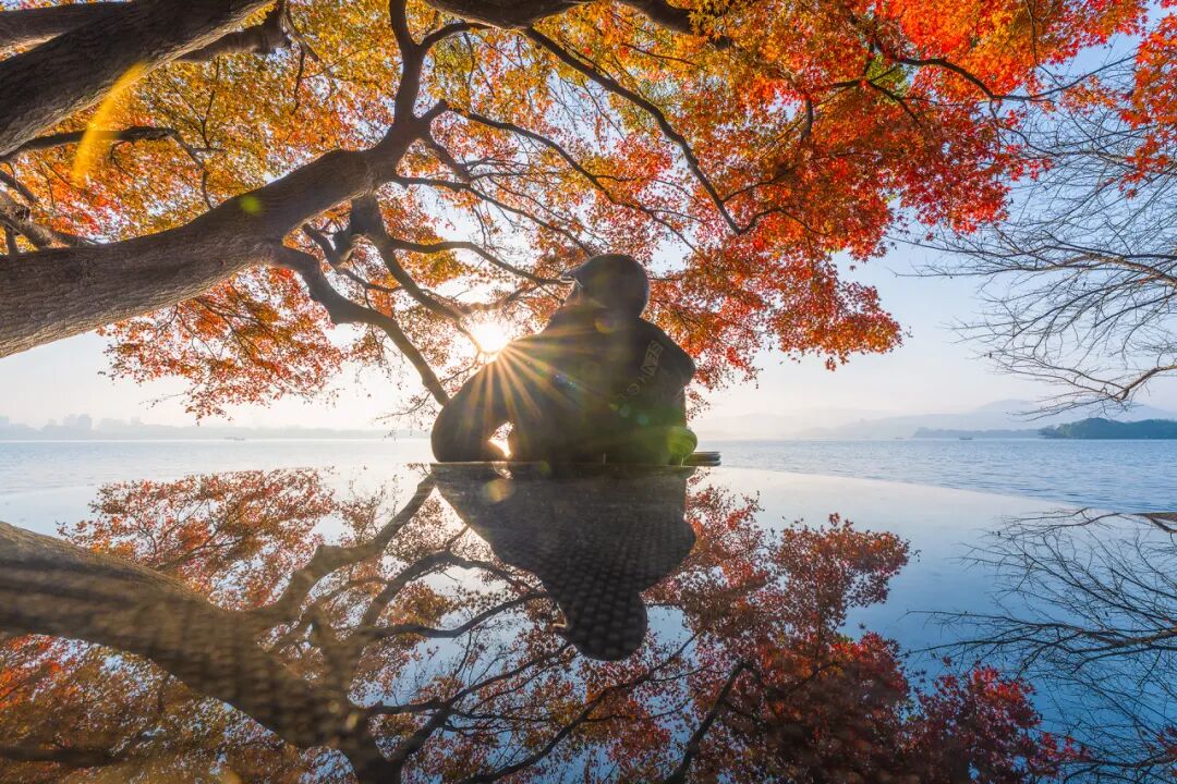 架起老蛙10mm镜头对准西湖边枫树,那超广视角一下将整株枫树与水面倒影全纳入。畸变极小,枫树线条笔直,色彩还原度极高,红叶似要溢出画面。水面倒影清晰,波光粼粼质感细腻,边缘过渡自然,助我轻松定格绝美秋景。