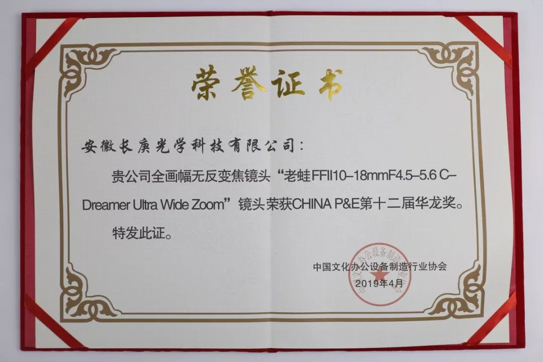安徽长庚光学科技有限公司推出的全画幅无反变焦镜头老蛙FFII10-18mmF4.5-5.6 C-Dreamer Ultra Wide Zoom斩获第十二届镜头组华龙奖