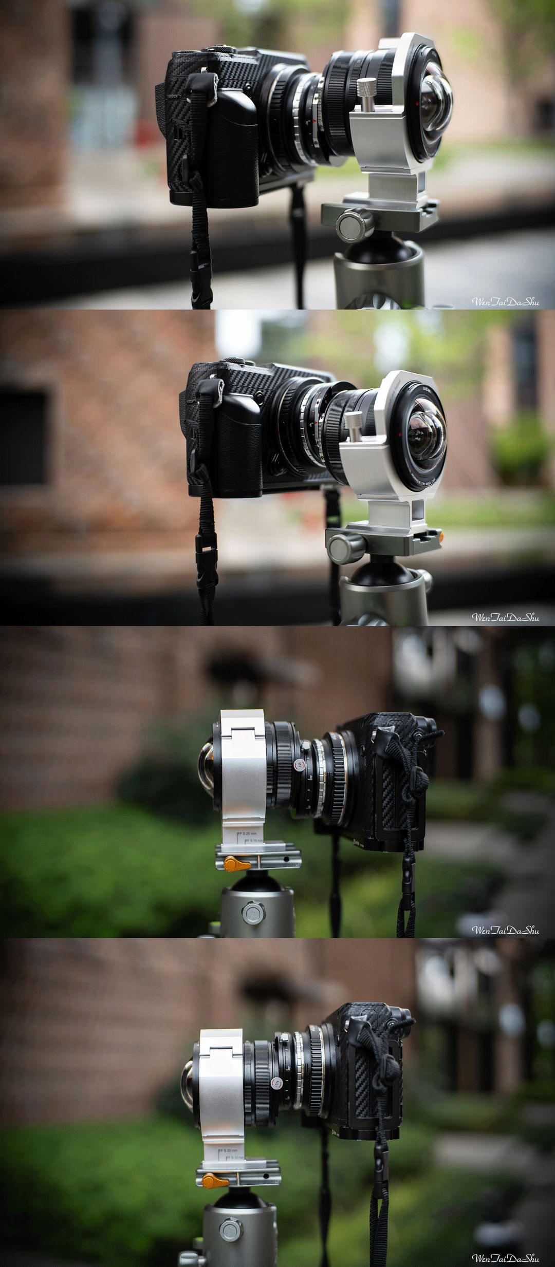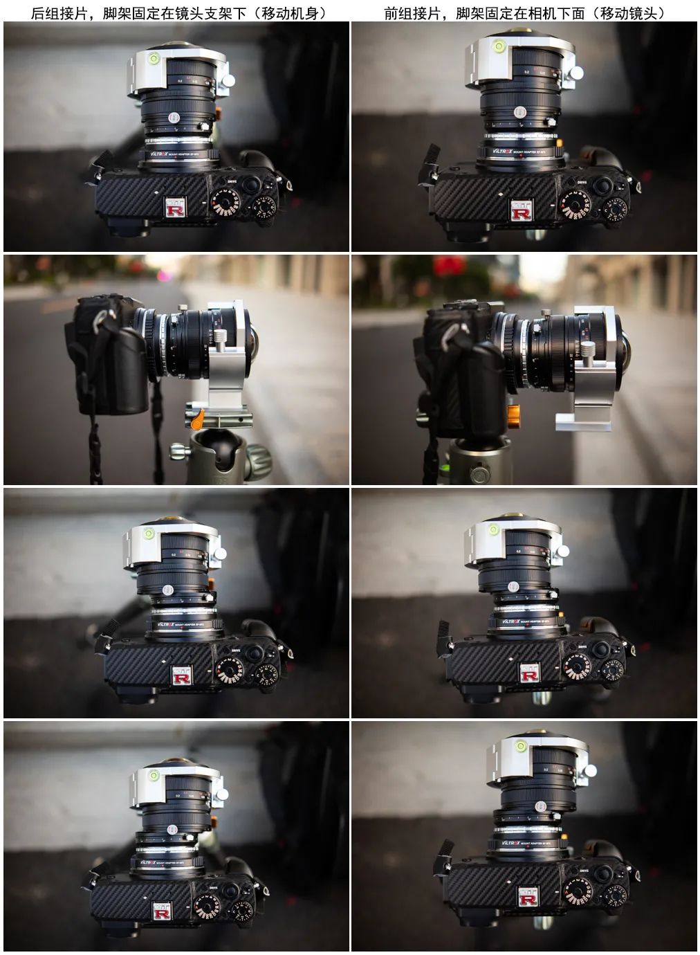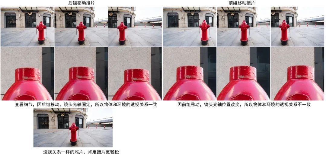 前组接片:脚架固定在相机下面,镜头动,机身不动,光轴位置改变。这就是最传统的拍摄接片方法。说白了也不需要这样的支架。但是在接片移动的过程中,镜头有移动,光轴位置也有变化,被摄物也会根据你镜头的移动,位置关系不同(打个比方来说,就好比你举起自己的手,左右眼分别看手和背景环境的关系,都是不一样的)这样就很难去接片合成了。很花时间。