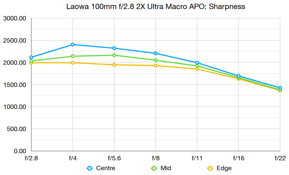 即使在最大光圈F2.8下,镜头的锐度都很惊人,画面全范围都是如此,并且一直保持到F11。锐度在F16和F22有所下滑,但仍然不错且中心与边缘没有什么差别。